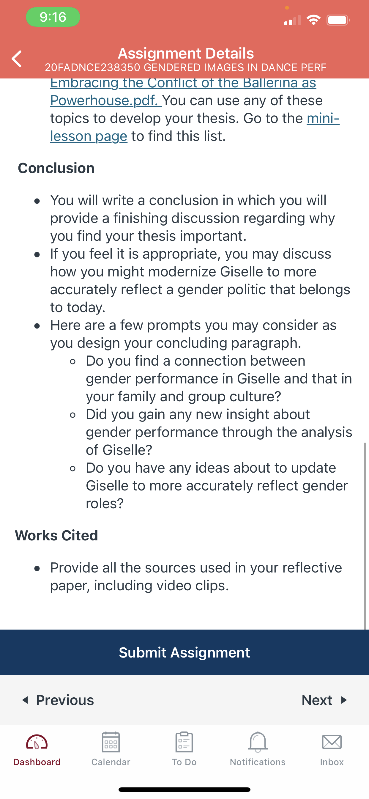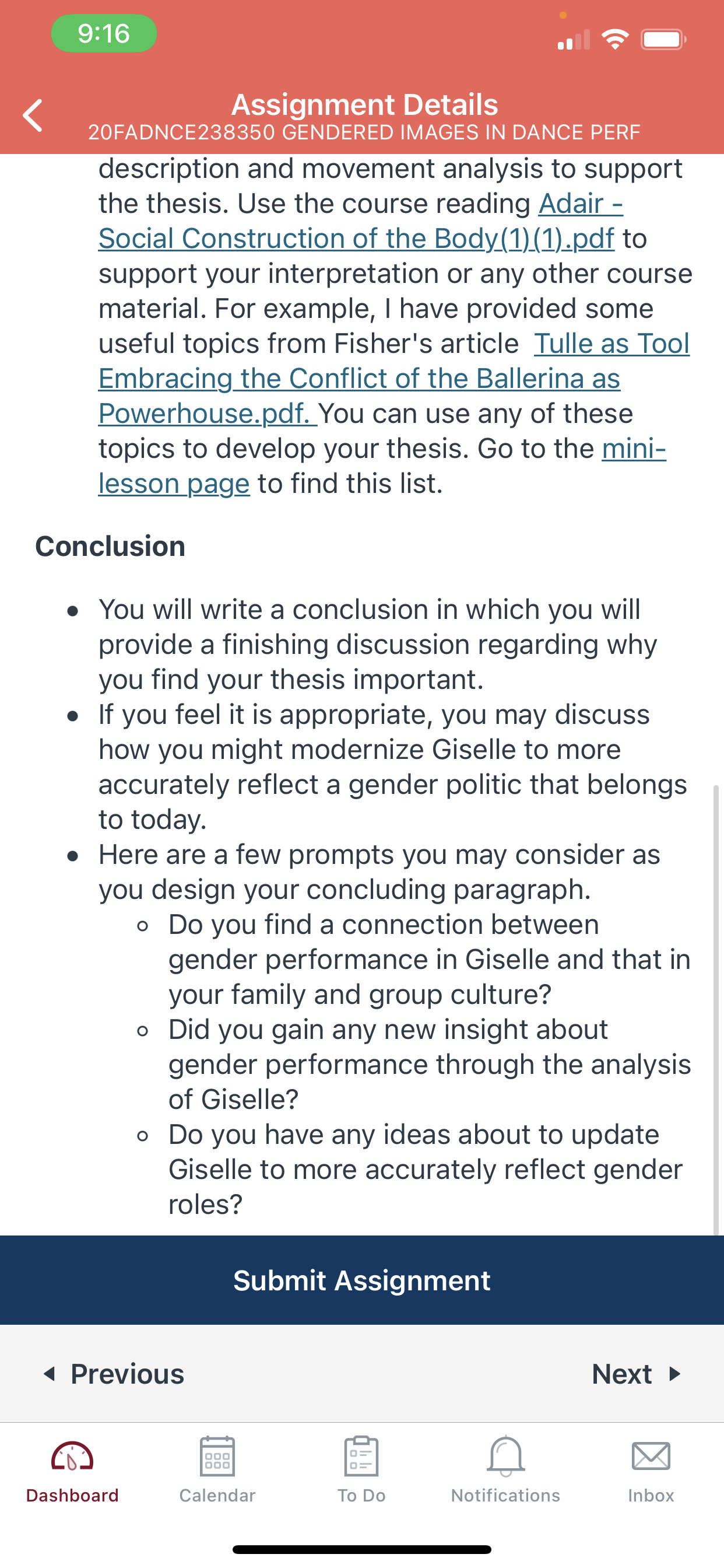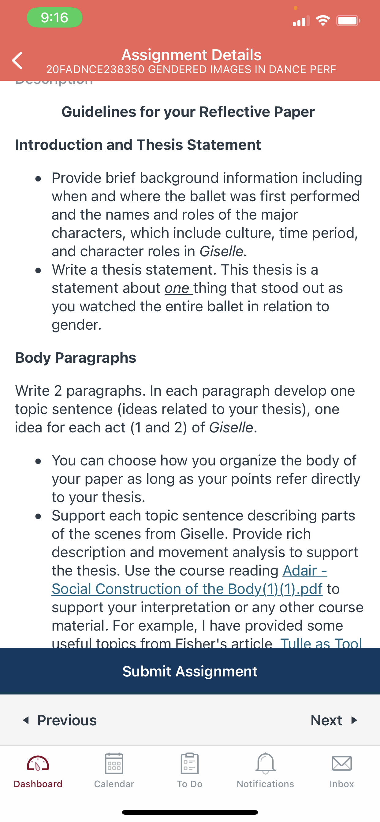 InstructionGuidelines for your Reflective Paper Introduction and Thesis Statement Provide brief background information including when and where the ballet was first performed and the names and roles of the major characters, which include culture, time period, and character roles in Giselle. Write a thesis statement. This thesis is a statement about one thing that stood out as you watched the entire ballet in relation to gender. Body Paragraphs Write 2 paragraphs. In each paragraph develop one topic sentence (ideas related to your thesis), one idea for each act (1 and 2) of Giselle. You can choose how you organize the body of your paper as long as your points refer directly to your thesis. Support each topic sentence describing parts of the scenes from Giselle. Provide rich description and movement analysis to support the thesis. Use the course reading Adair - Social Construction of the Body(1)(1).pdf to support your interpretation or any other course material. For example, I have provided some useful topics from Fisher's article Tulle as Tool Embracing the Conflict of the Ballerina as Powerhouse.pdf. You can use any of these topics to develop your thesis. Go to the mini-lesson page to find this list. Conclusion You will write a conclusion in which you will provide a finishing discussion regarding why you find your thesis important. If you feel it is appropriate, you may discuss how you might modernize Giselle to more accurately reflect a gender politic that belongs to today. Here are a few prompts you may consider as you design your concluding paragraph. Do you find a connection between gender performance in Giselle and that in your family and group culture? Did you gain any new insight about gender performance through the analysis of Giselle? Do you have any ideas about to update Giselle to more accurately reflect gender roles? Works Cited Provide all the sources used in your reflective paper, including video clips.