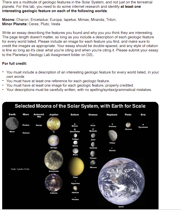 InstructionWrite an essay describing the features you found and why you you think they are interesting. The page length doesn't matter, so long as you include a description of each geologic feature for every world listed. Please include an image for each feature you find, and make sure to credit the images as appropriate. Your essay should be double-spaced, and any style of citation is fine so long as it's clear what you're citing and when you're citing it For full credit:-You must include a description of an interesting geologic feature for every world listed, in your own words.-You must have at least one reference for each geologic feature.-You must have at least one image for each geologic feature, properly credited.-Your descriptions must be carefully written, with no spelling/syntax/grammatical mistakes