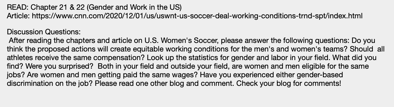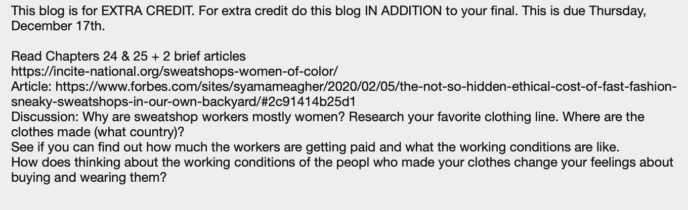 Articles to read for post 1: https://incite-national.org/sweatshops-women-of-color/ https://www.forbes.com/sites/syamameagher/2020/02/05/the-not-so-hidden-ethical-cost-of-fast-fashion-sneaky-sweatshops-in-our-own-backyard/#2c91414b25d1 My favorite brand is Brandy Melville Article to read for post 2: https://www.cnn.com/2020/12/01/us/uswnt-us-soccer-deal-working-conditions-trnd-spt/index.html Only need like 300-400 words for each post.