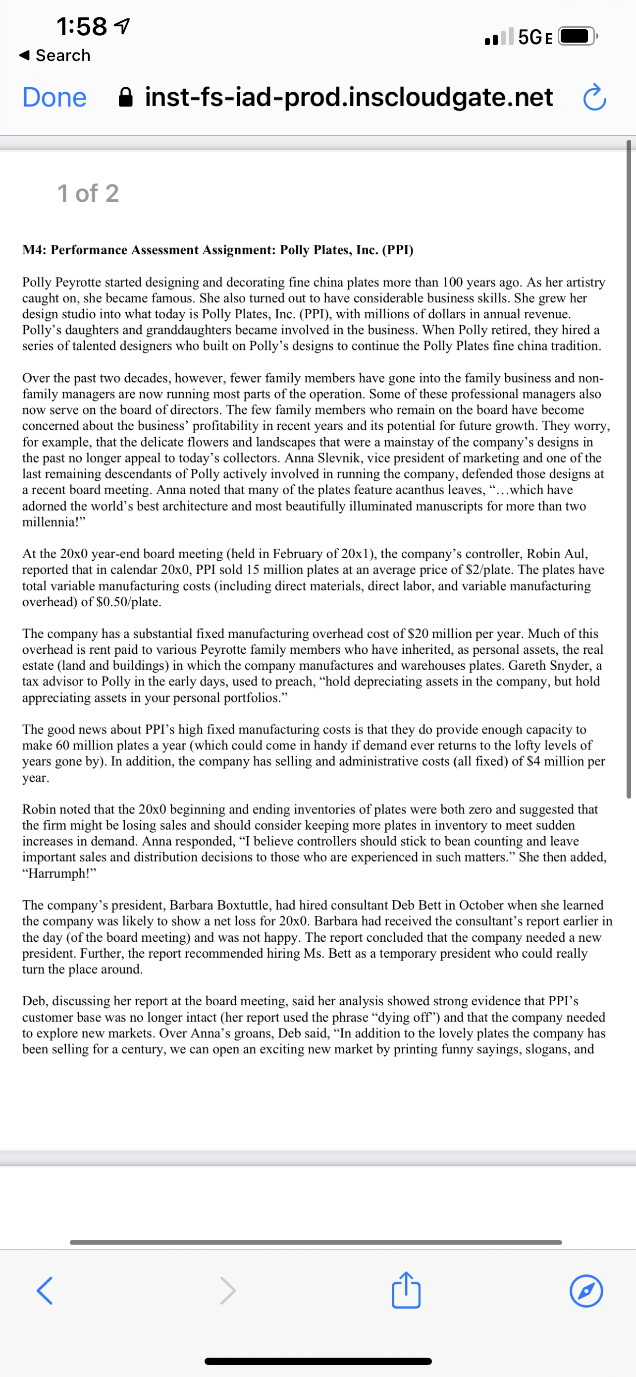 InstructionRequirements Prepare an income statement in reasonably good form for Polly Plates’ 20x0 year. Use the absorption costing format (also known as the “GAAP” or “external financial reporting” format). One of the board members, hearing of the net loss expected for 20x0 at the first board meeting described above, asked whether anyone knew how many plates the company would need to sell to break even. Calculate PPI’s breakeven point (in plates) using 20x0’s cost structure. Recall that a company’s cost structure is its selling price per unit, variable cost per unit, and total fixed cost. Another board member at the 20x0 meeting responded to that query, asking, “Who cares what it takes to make zero net income? I’d like to know what sales would be necessary to make $2 million a year… as we did in the old days! Harrumph!” Calculate the sales (in plates) PPI needed to yield a net income of $2 million, using 20x0’s cost structure. As the discussion about breakeven points and profit planning wound down, an elderly board member awoke from his nap, saw the breakeven charts on the projection screen, and mumbled something about “direct costing.” His granddaughter (also on the board and a recent MBA graduate) responded by saying, “Wait! I think I remember that term. Yes, in fact, you can do a whole income statement using direct costing. In Professor Blatterfitzel’s class, we called it ‘variable costing’ or the ‘contribution margin format income statement,’ or something like that.” Prepare an income statement in reasonably good form for PPI’s 20x0 year using variable costing (also called “direct costing” or “the contribution margin format”). Prepare the GAAP (absorption costing format) income statement in reasonably good form for PPI’s 20x1 year (show the results just as the controller would have … before taxes and Deb’s bonus). Calculate PPI’s 20x1 ending inventory amount (under absorption costing), in both plates and dollars. Prepare PPI’s 20x1 income statement in reasonably good form using variable costing (also called direct costing or contribution margin format costing). Show the net income before taxes and before Deb’s bonus so it is comparable to Robin’s absorption cost net income. Assume that you are a member of PPI’s board of directors and you receive an email from an R. J. Squirl at Kernel Mills requesting a reference check on Deb Bett. Assume further that you have completed thoughtfully the preceding three requirements and that you have excellent liability insurance that fully indemnifies you for any statements you make as a board member. Write the text of an email (200 words or less) that expresses your honest opinion of Deb Bett’s performance during her one year as president of PPI.