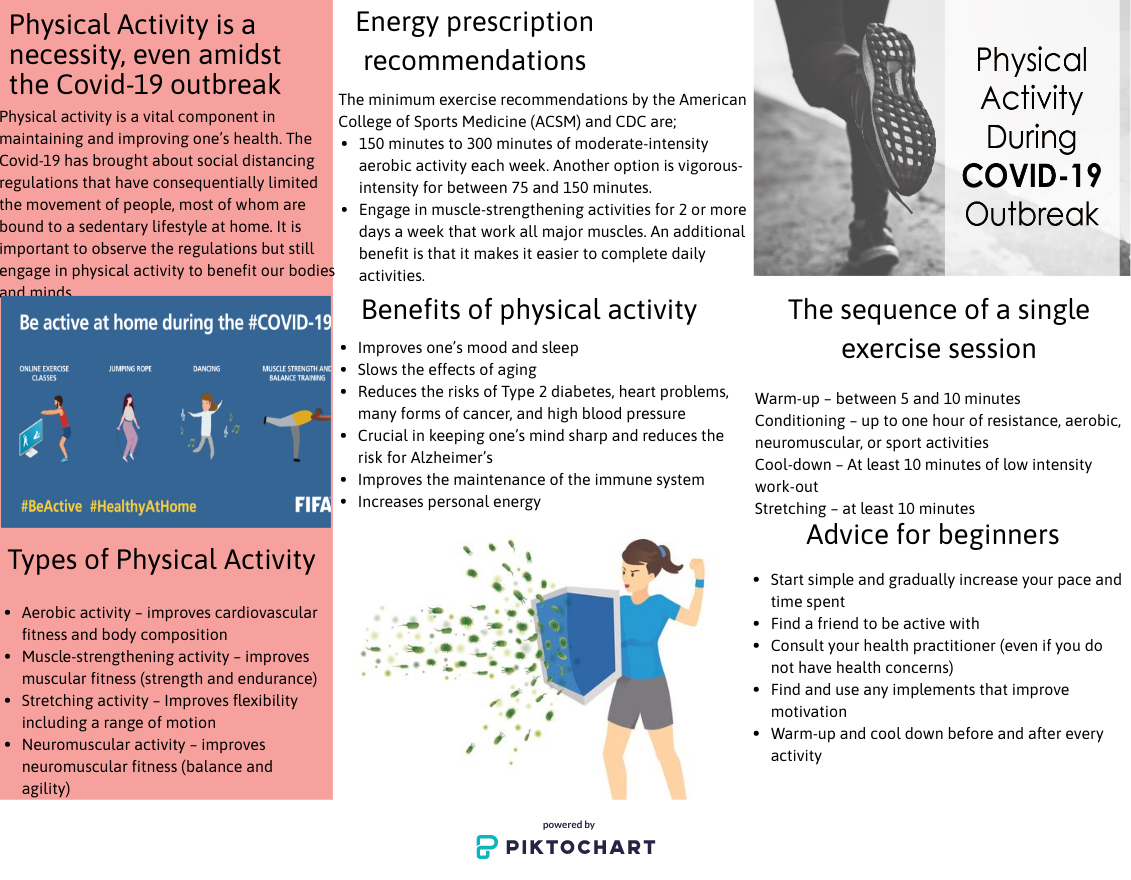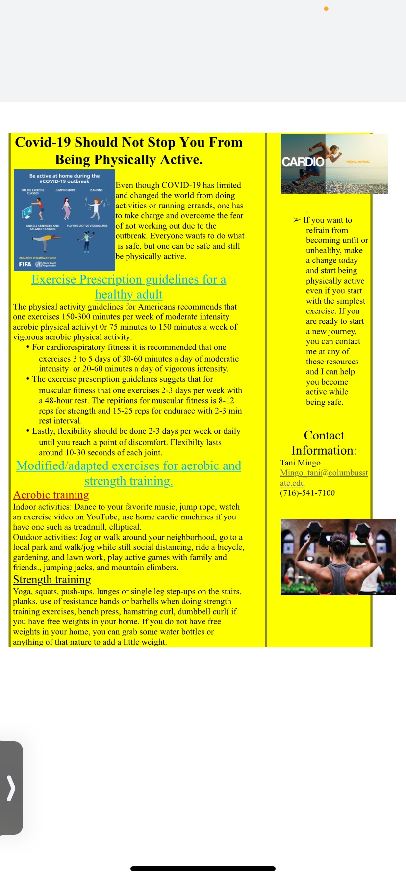 • For this assignment, you will be modifying the general principles of exercise prescription to fit the most current public health problem, COVID-19. You will create a professional information flyer that could be distributed to healthy adults on how to exercise safely and effectively.