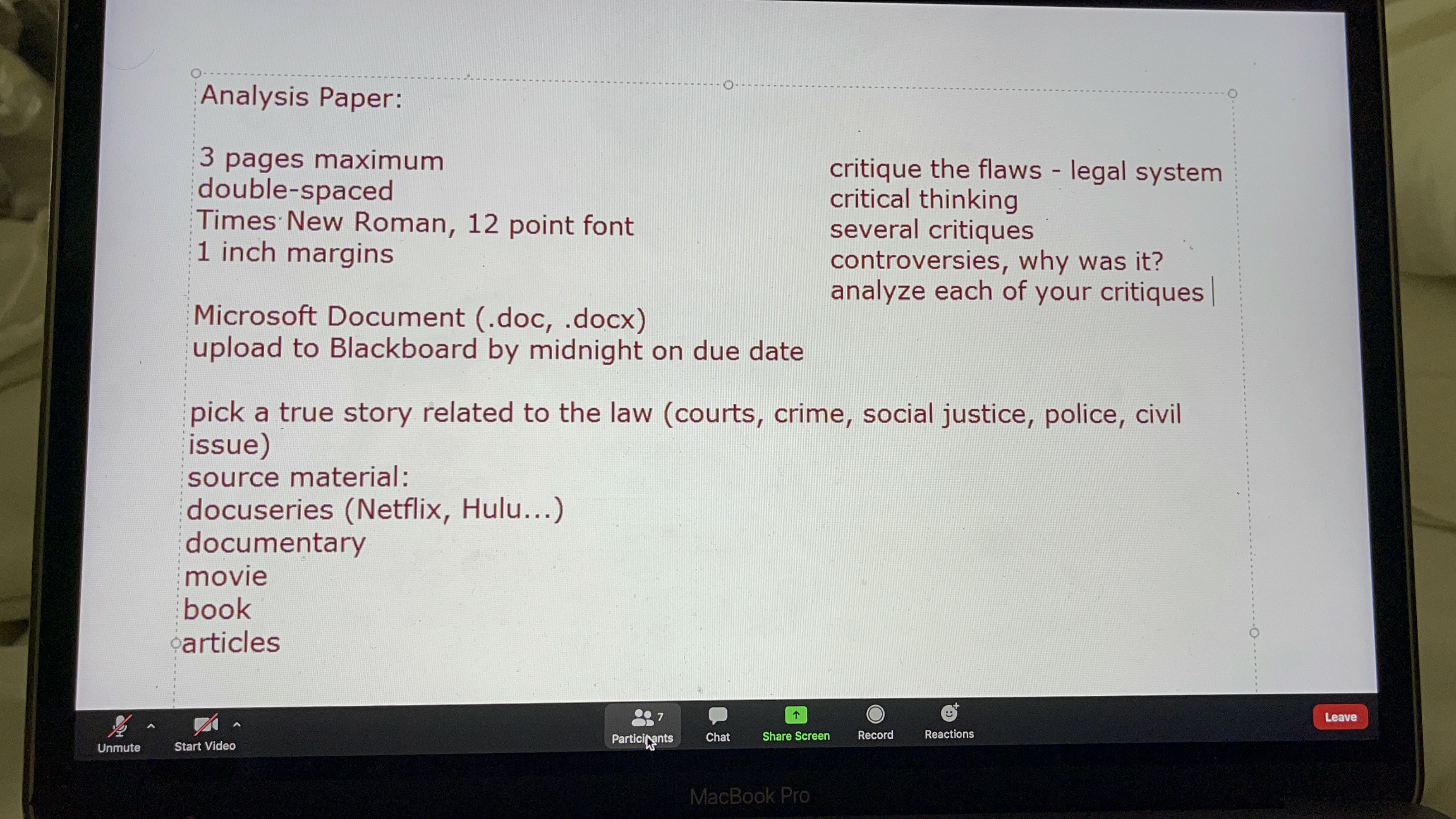 • Analysis paper: write 3 pages about a true story related to the law (courts, crime, social justice, police, civil issue ) include: critique the flaws critical thinking several critiques controversies, why was it? Source material: docuseries( Netflix-hulu...) Documentary movie book Article ( no quote)