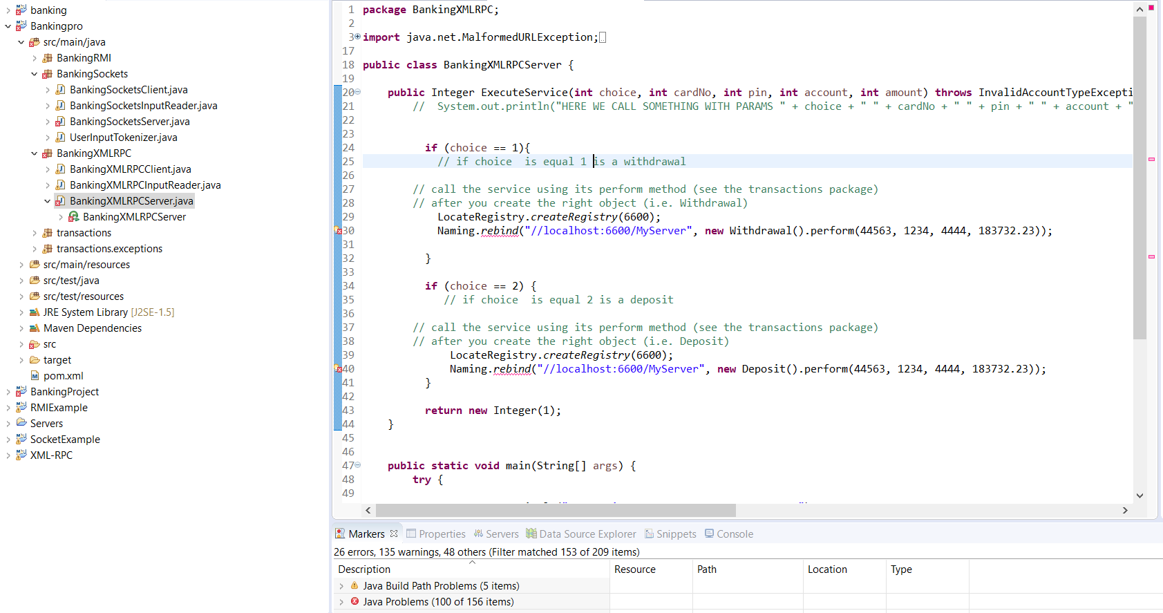 • Fill in the parts of the code missing in the following files: 1. BankingSocketsClient.java 2. BankingSocketsServer.java 3. BankingXMLRPCClient.java 4. BankingXMLRPCServer.java 5. BankingRMIClient.java 6. BankingRMIServer.java The points the code needs be added is flagged in the code as // ITEC_4020: ADD CODE HERE