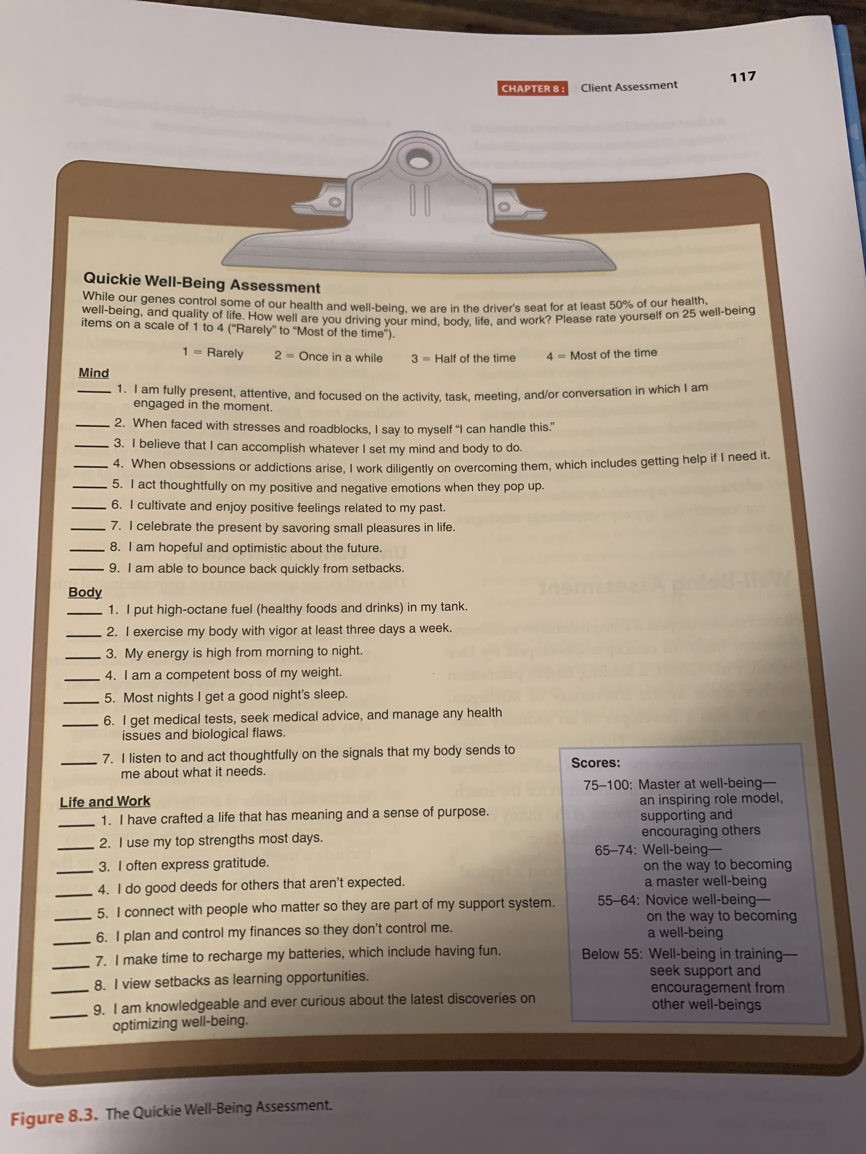 • Well-Being Assessments Six Dimensions of Wellness The Wheel of Life Values-in-Action (VIA) Signature Strengths Questionnaire The Quality of Life Inventory DISC: Dominance, influence, steadiness, and compliance — a 4 quadrant behavioral model Myers-Briggs Type Indicator Positivity Ratio Self-Compassion Scale Mindful Attention Awareness Scale (MAAS) Five-Facet Mindfulness Scale Quickie Well-Being Assessment Decisional Balance Tool Transtheoretical Model of Change these are the 13 different assessments.