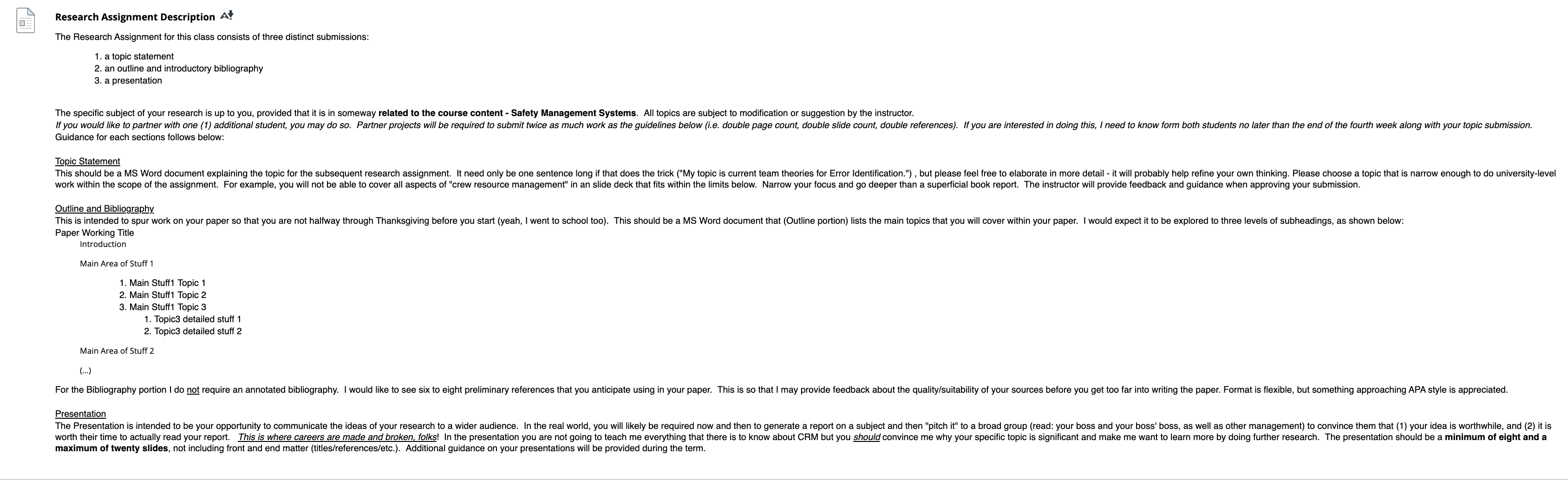 the instructions are in the screenshot attached I only need help in the Outline and Bibliography section. I want it to be between 2-3 pages this class is Safety Management systems class and my topic statement is Hazard materials transportation in aviation. I Need it in 5 hours maximum