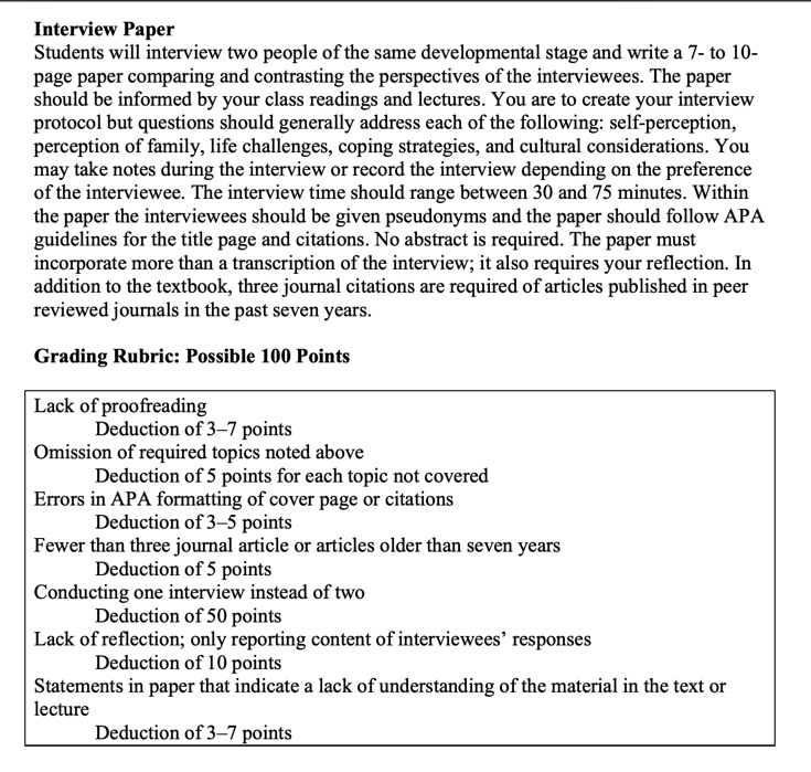 InstructionStudents will interview two people of the same developmental stage and write a 7- to 10- page paper comparing and contrasting the perspectives of the interviewees. The paper should be informed by your class readings and lectures. You are to create your interview protocol but questions should generally address each of the following: self-perception, perception of family, life challenges, coping strategies, and cultural considerations. You may take notes during the interview or record the interview depending on the preference of the interviewee. The interview time should range between 30 and 75 minutes. Within the paper the interviewees should be given pseudonyms and the paper should follow APA guidelines for the title page and citations. No abstract is required. The paper must incorporate more than a transcription of the interview; it also requires your reflection. In addition to the textbook, three journal citations are required of articles published in peer reviewed journals in the past seven years. The textbook used is Berk, L. E. (2018). Development through the lifespan (7th ed.). Boston, MA: Pearson.
