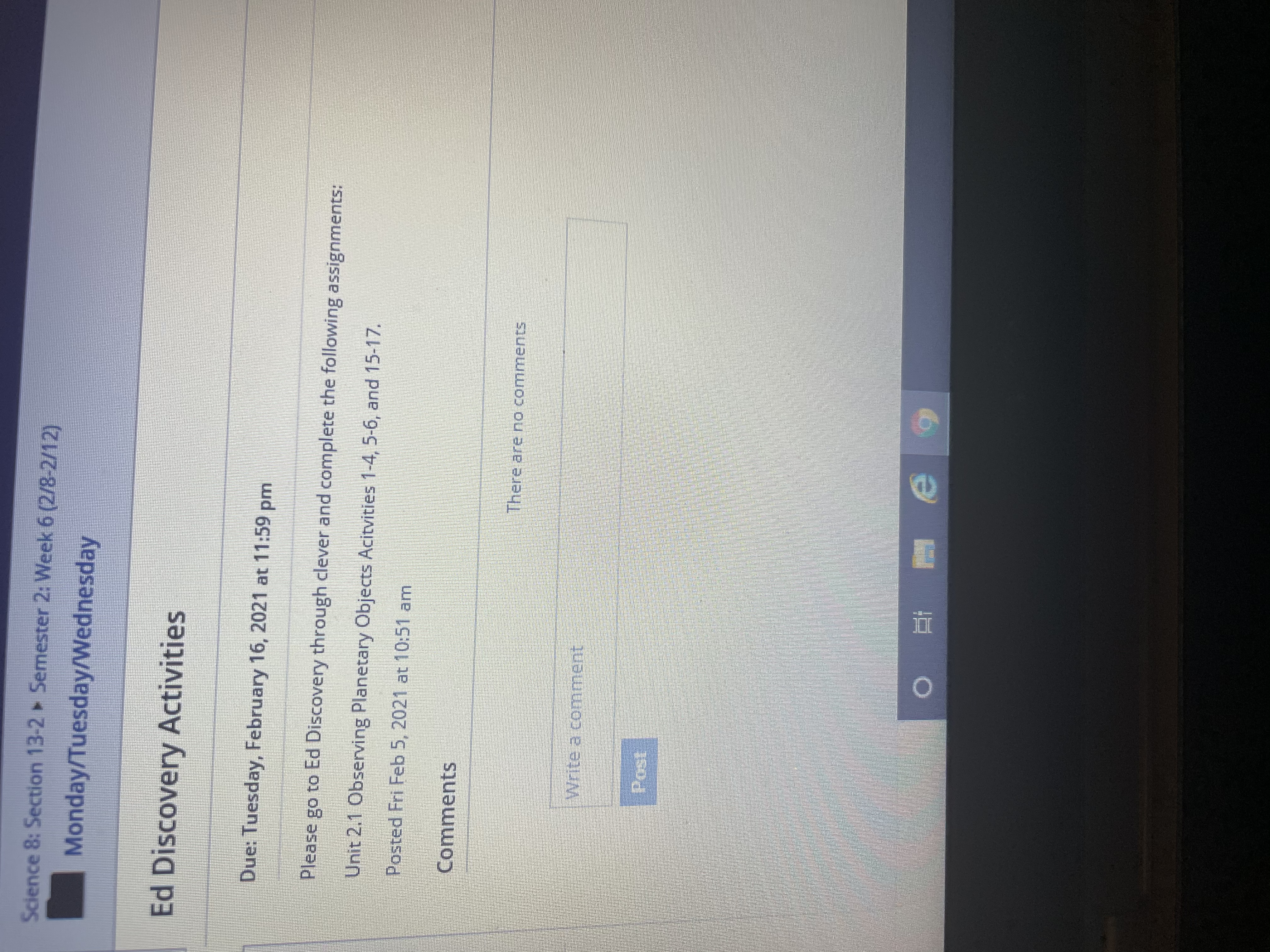 • It is two assignments. Ed Discoveries and How big is the universe. You mentioned earlier you were online and in front of the computer. It's 9:30pm.