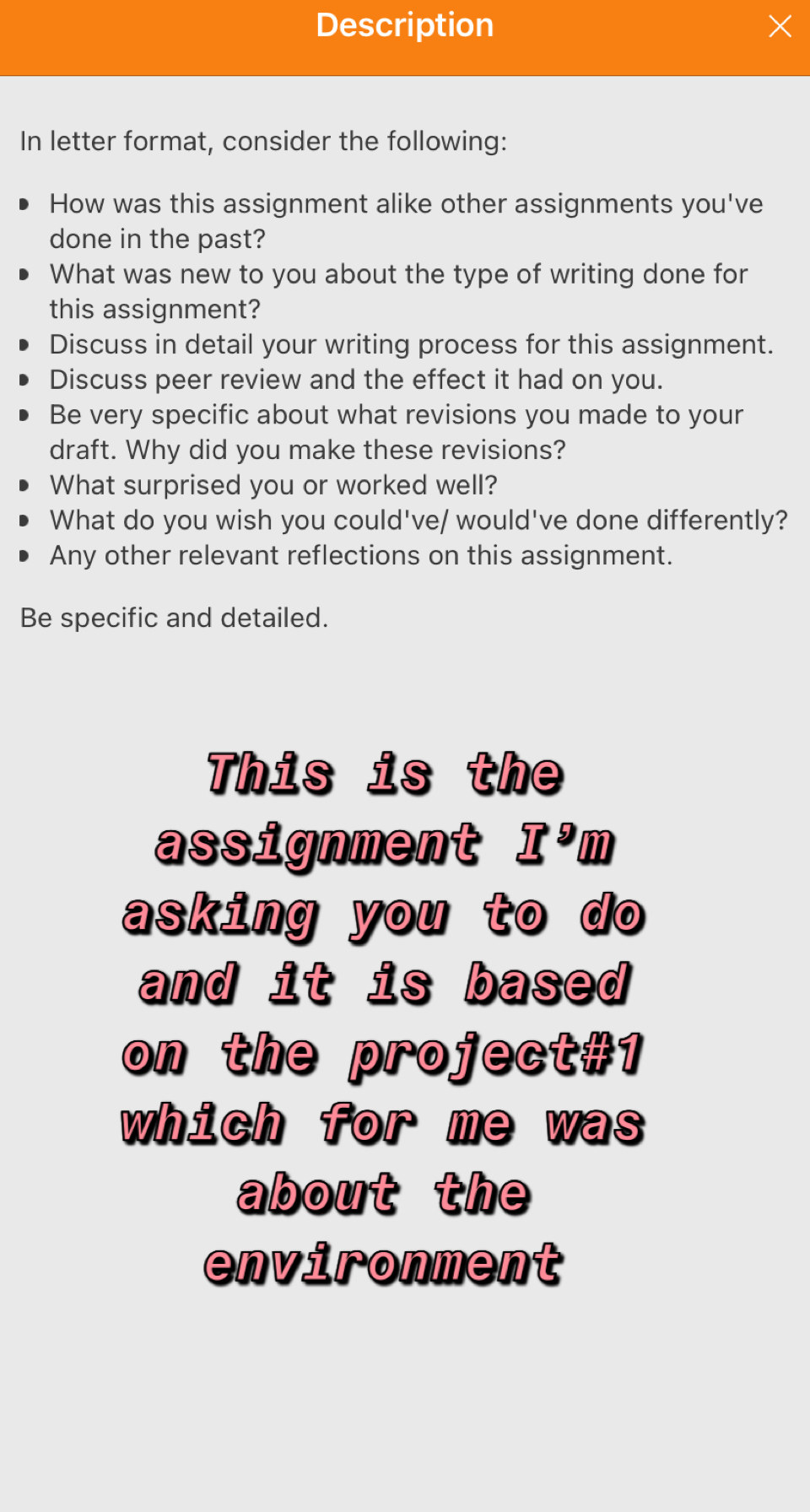 How was this assignment alike other assignments you've done in the past? What was new to you about the type of writing done for this assignment? Discuss in detail your writing process for this assignment. Discuss peer review and the effect it had on you. Be very specific about what revisions you made to your draft. Why did you make these revisions? What surprised you or worked well? What do you wish you could've/ would've done differently? Any other relevant reflections on this assignment.
