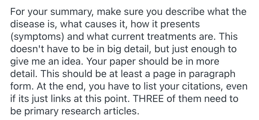 Write 1-2 pages on Tay-Sachs disease. make sure you describe what the disease is, what causes it, how it presents (symptoms) and what current treatments are. This doesn't have to be in big detail, but just enough to give me an idea. Your paper should be in more detail. This should be at least a page in paragraph form. At the end, you have to list your citations, even if its just links at this point. THREE OF THEM NEED TO BE PRIMARY RESEARCH ARTICLES.