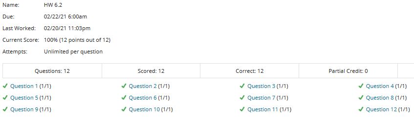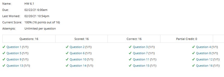 • I have completed both sections. Please check and release my payment with 10/10 ratings. Next upcoming due 03/01/21 Homework HW 6.3 Homework HW 6.4 Quiz Chapter 06 Quiz Please create a new request.
