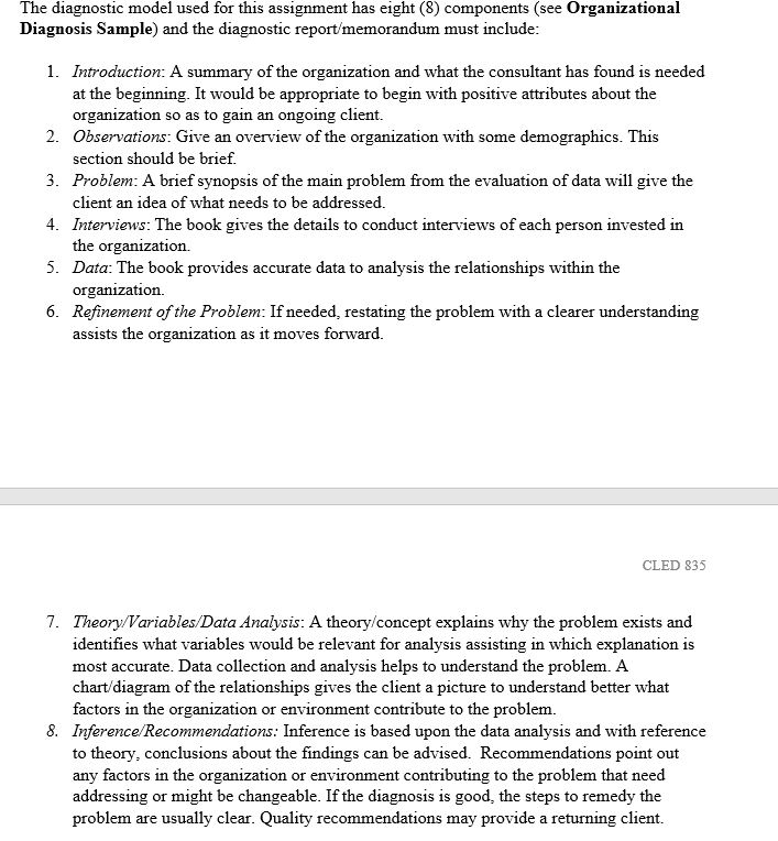 1. Introduction: A summary of the organization and what the consultant has found is needed at the beginning. It would be appropriate to begin with positive attributes about the organization so as to gain an ongoing client. 2. Observations: Give an overview of the organization with some demographics. This section should be brief. 3. Problem: A brief synopsis of the main problem from the evaluation of data will give the client an idea of what needs to be addressed. 4. Interviews: The book gives the details to conduct interviews of each person invested in the organization. 5. Data: The book provides accurate data to analysis the relationships within the organization. 6. Refinement of the Problem: If needed, restating the problem with a clearer understanding assists the organization as it moves forward. 7. Theory/Variables/Data Analysis: A theory/concept explains why the problem exists and identifies what variables would be relevant for analysis assisting in which explanation is most accurate. Data collection and analysis helps to understand the problem. A chart/diagram of the relationships gives the client a picture to understand better what factors in the organization or environment contribute to the problem. 8. Inference/Recommendations: Inference is based upon the data analysis and with reference to theory, conclusions about the findings can be advised. Recommendations point out any factors in the organization or environment contributing to the problem that need addressing or might be changeable. If the diagnosis is good, the steps to remedy the problem are usually clear. Quality recommendations may provide a returning client.