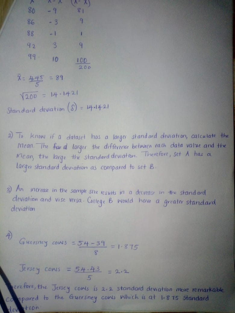 • 1)Calculate the standard deviation by hand (show work) for the following test scores. 80, 86, 88, 92, 99 2) Which of the following data sets has a greater standard deviation? Explain how you would know the answer to this question without actually calculating the standard deviation in each case. Set A: 50, 60, 80, 90 Set B: 5, 6, 8, 9 3) A statistics class at college A has 100 students. There are 50 male students in the class and 50 female students in the class. A statistics class at college B also has 100 students. All the students in this class are female. Consider the following data sets: 1)The heights of the students in the Statistics class at College A 2) The heights of the students in the Statistics class at College B. Which data set will likely have a greater standard deviation? Explain. assignment May 31, 2019 #2 Two sample problems with solutions: Now answer this question: 4)