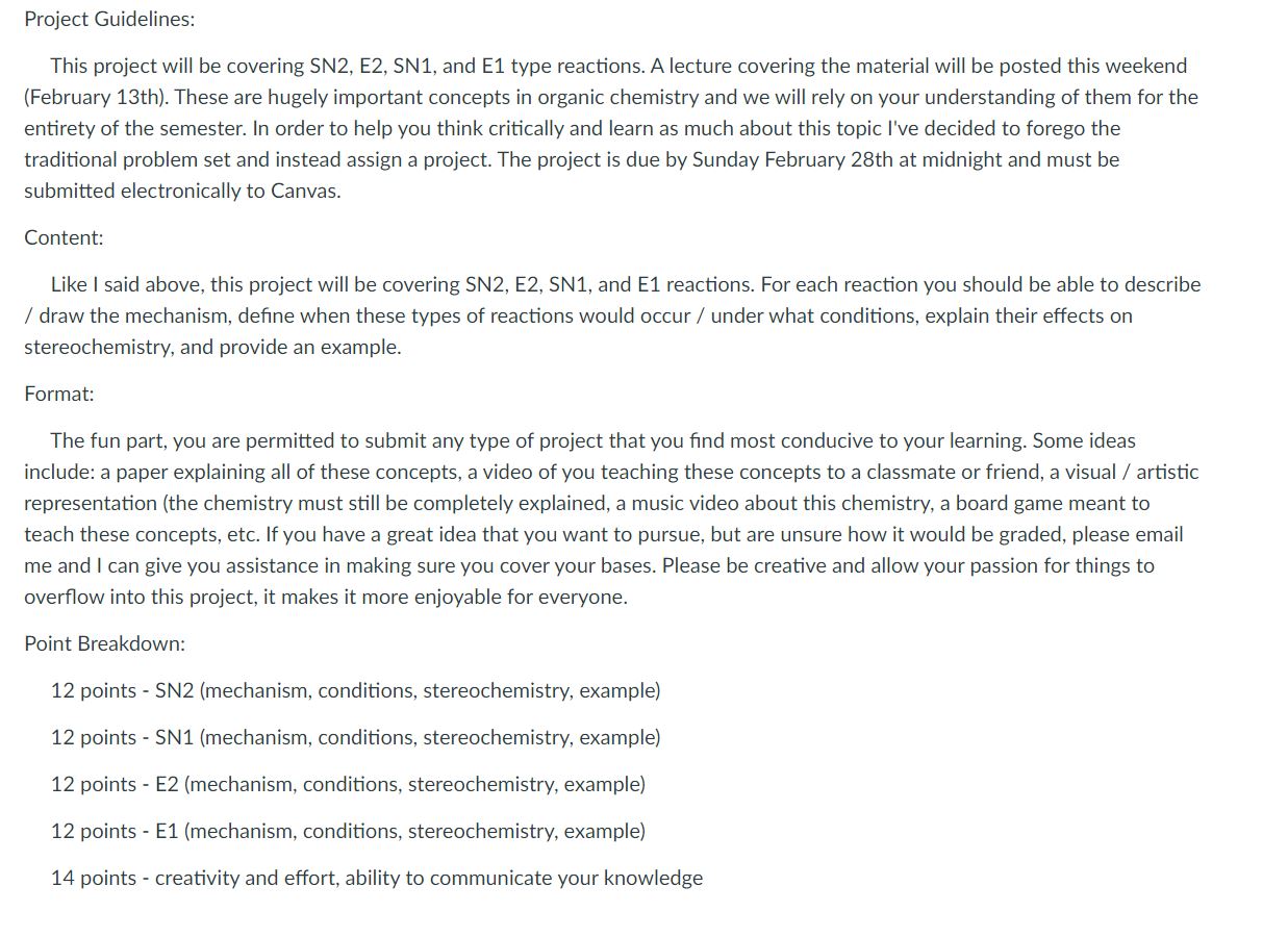 InstructionProject Guidelines: This project will be covering SN2, E2, SN1, and E1 type reactions. A lecture covering the material will be posted this weekend (February 13th). These are hugely important concepts in organic chemistry and we will rely on your understanding of them for the entirety of the semester. In order to help you think critically and learn as much about this topic I've decided to forego the traditional problem set and instead assign a project. The project is due by Sunday February 28th at midnight and must be submitted electronically to Canvas. Content: Like I said above, this project will be covering SN2, E2, SN1, and E1 reactions. For each reaction you should be able to describe / draw the mechanism, define when these types of reactions would occur / under what conditions, explain their effects on stereochemistry, and provide an example. Format: The fun part, you are permitted to submit any type of project that you find most conducive to your learning. Some ideas include: a paper explaining all of these concepts, a video of you teaching these concepts to a classmate or friend, a visual / artistic representation (the chemistry must still be completely explained, a music video about this chemistry, a board game meant to teach these concepts, etc. If you have a great idea that you want to pursue, but are unsure how it would be graded, please email me and I can give you assistance in making sure you cover your bases. Please be creative and allow your passion for things to overflow into this project, it makes it more enjoyable for everyone. Point Breakdown: 12 points - SN2 (mechanism, conditions, stereochemistry, example) 12 points - SN1 (mechanism, conditions, stereochemistry, example) 12 points - E2 (mechanism, conditions, stereochemistry, example) 12 points - E1 (mechanism, conditions, stereochemistry, example) 14 points - creativity and effort, ability to communicate your knowledge