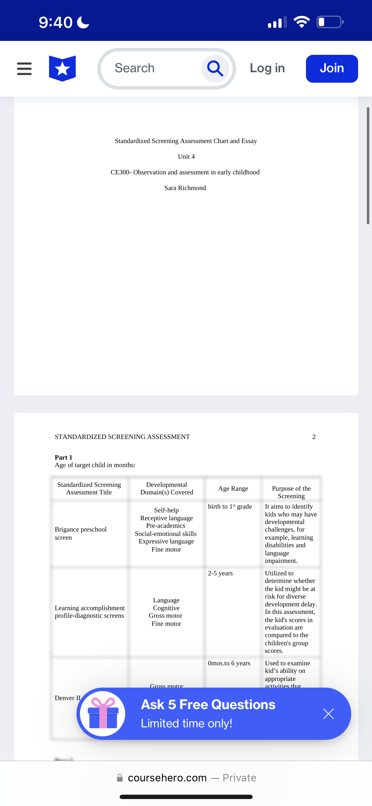 InstructionPart 1: Standardized Screening Assessment Chart This chart will explore one standardized screening assessment that would be appropriate for the age of the typically developing target child you have chosen for your observation for this course. You will not actually administer this standardized screening in this course, as this is a simulated assignment. In order to administer a standardized screening assessment, you would need to have access to and training on the assessment instrument and direct supervision of administration. Therefore, we will only discuss standardized assessment in this course, not administer them to a child. When creating your chart, you must select an appropriate standardized screening assessment based on the age of your typically developing target child. Use the following resources to select an appropriate standardized screening assessment: Developmental Screening Tools Early Childhood Developmental Screening Milestone Checklist and Developmental Screenings The first part of the template contains the categories highlighted below: Age of typically developing target child in months Standardized Screening Assessment Title: Be sure to provide the full name using APA format. Developmental Domain(s) Covered: Which are addressed in the screening assessment (motor, physical growth, social, emotional, behavior, communication, etc.)? Age Range: What is the appropriate age range for administering the standardized screening assessment to the child? Be sure this age range corresponds to the age of your typically developing target child. Purpose of the Screening: What can an early childhood professional do with the results based on your typically developing target child? What should happen next? Be sure to discuss the limitations of screening instruments. Part 2: Standardized Screening Assessments Essay Case Scenario: Imagine that you have been hired as the new director of an Early Childhood Program in which your typically developing target child is enrolled. During the interview and hiring process, you realize that the culture in this Early Childhood Program has historically centered on the use of informal portfolios as the sole assessment format. The staff and families enjoy the use of portfolios and are very satisfied with this type of informal assessment. You would like to propose using standardized screening assessments for all of the children in this setting as best practice indicates the use of both standardized screening assessment scores and non-standardized assessments to assist with the assessment and evaluation of young children. To prepare for your essay discussion on the importance of respecting the culture in early childhood, please be sure to read the following resources prior to beginning this part of the assignment. School Culture School Culture and Climate In the second part of the template, you will discuss the following using the case scenario above: What is this organization’s culture concerning assessment? Why is this organization’s culture on assessment important to understand? How would you discuss your proposal to use the standardized screening assessment you discussed in Part 1 for your typically developing target child, while respecting the culture and role of informal, non-standardized assessment?