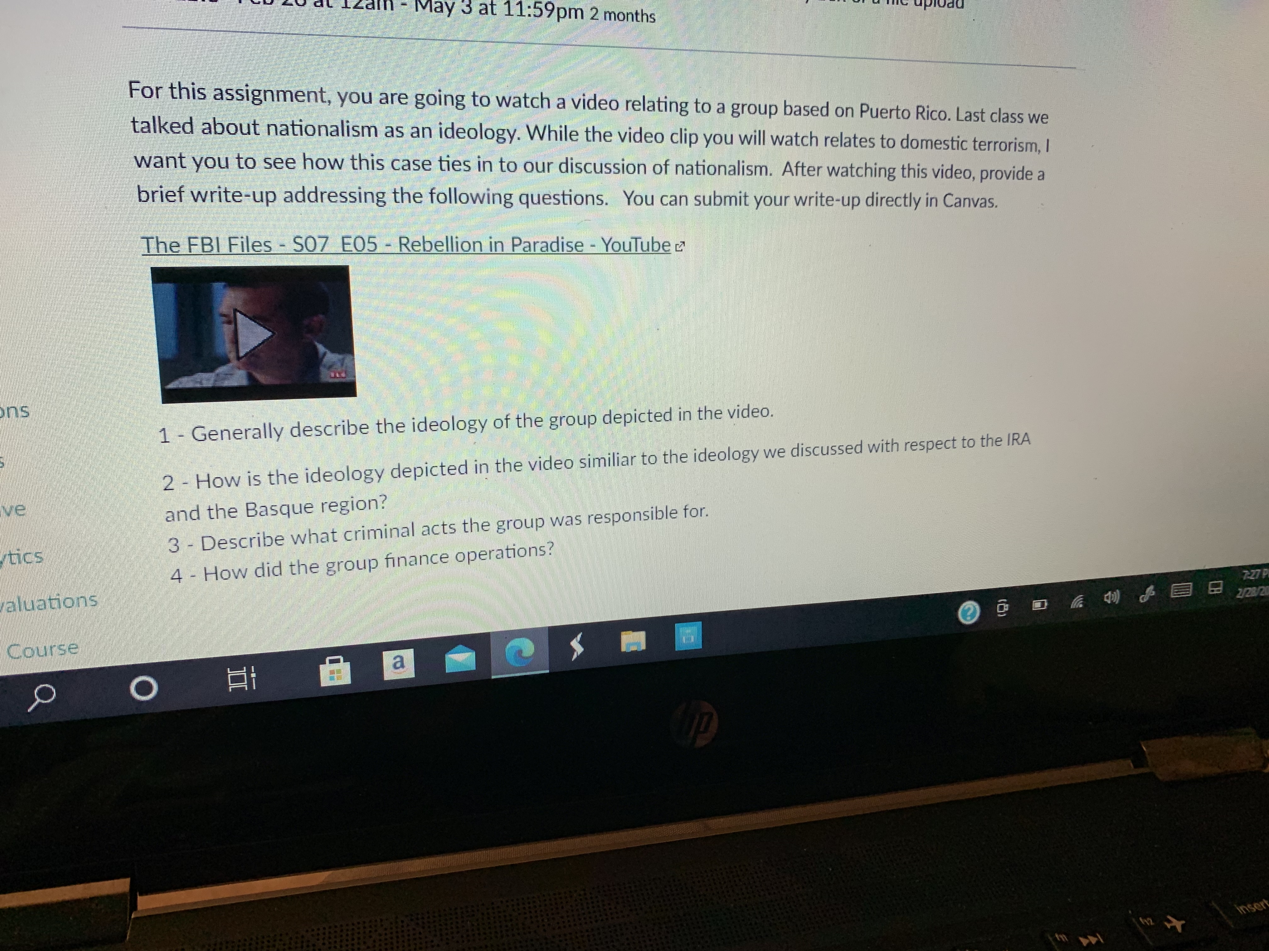 Video (The FBI Files-07 E05 - Rebellion in Paradise- YouTube Questions 1) Generally describe the ideology of the group depicted in the video. 2) How is the ideology depicted in the video similar to the ideology we discussed with respect to the IRA and the Basque region? 3) Describe what criminal acts the group was responsible for. 4) How did the group finance operations?