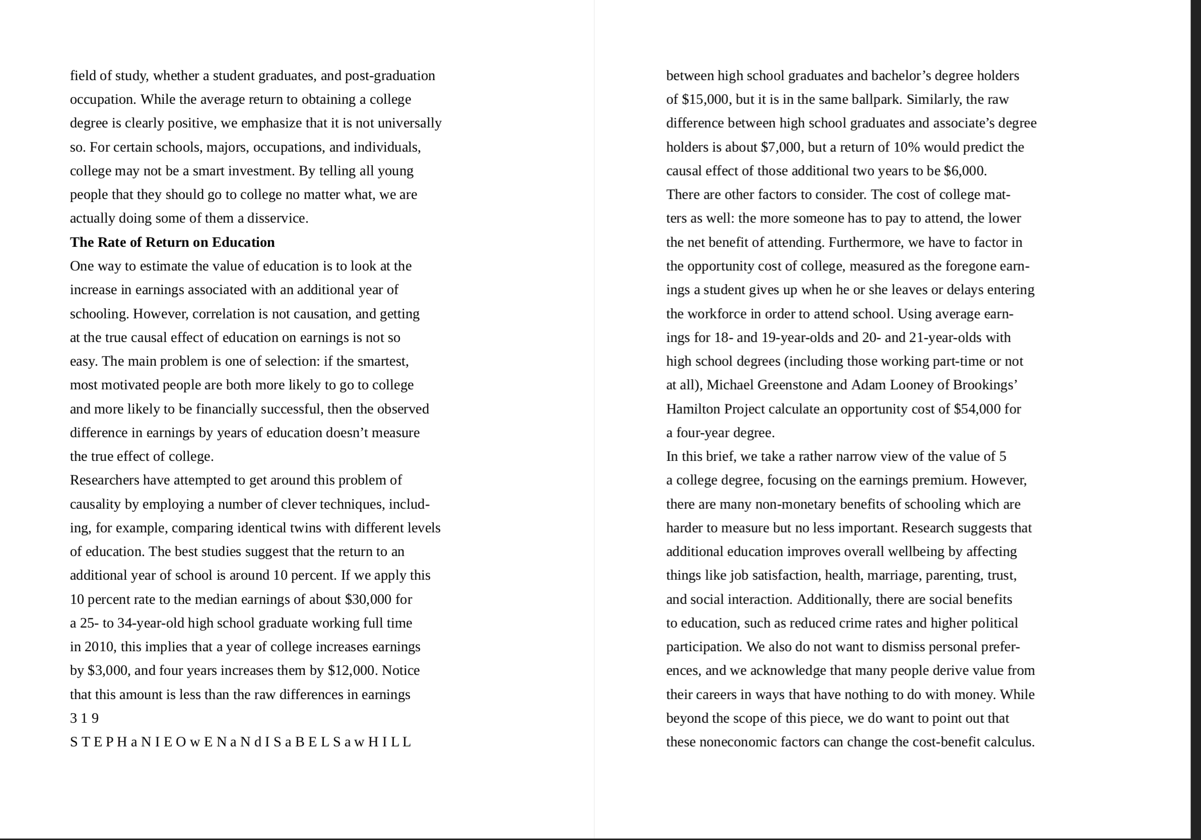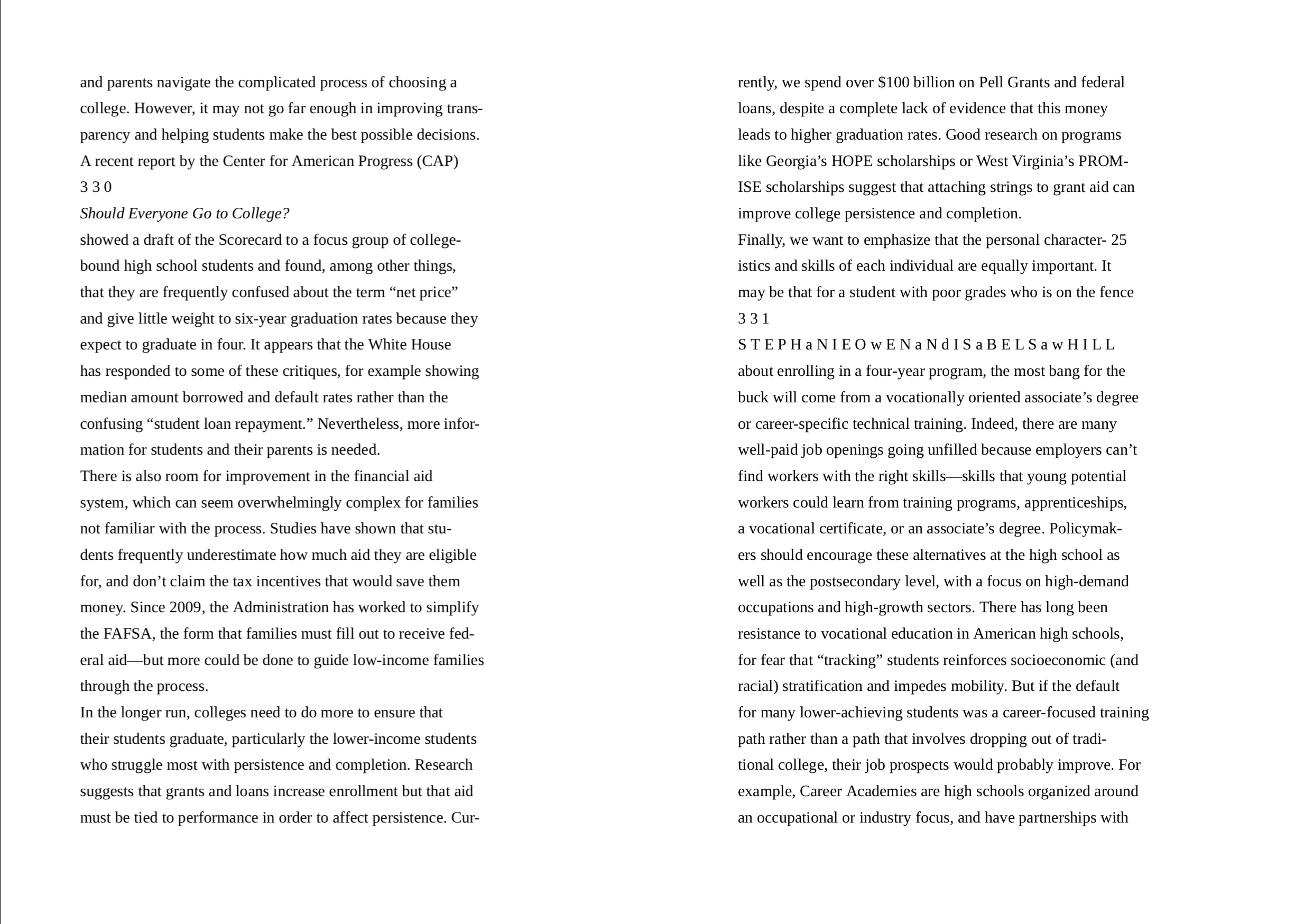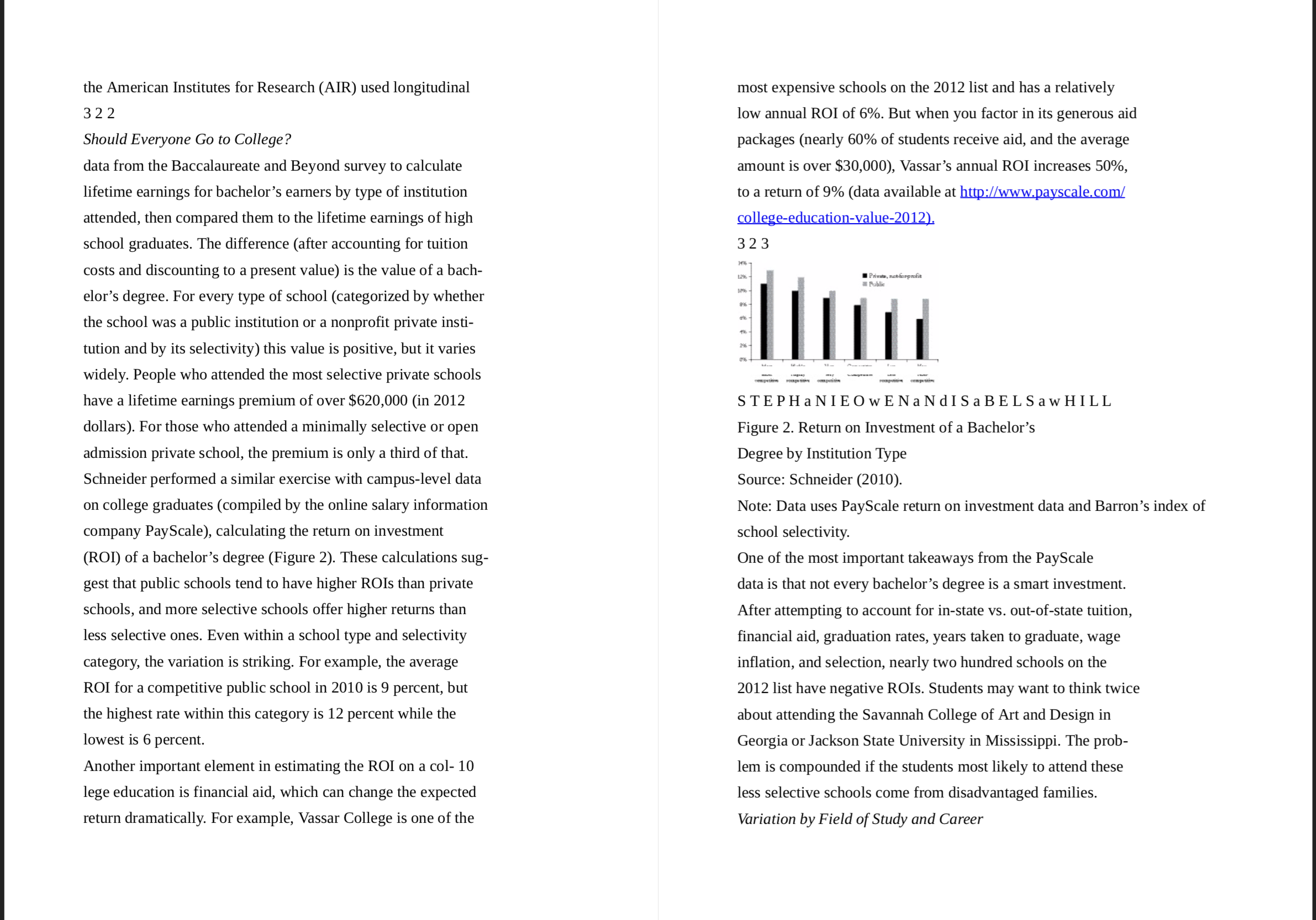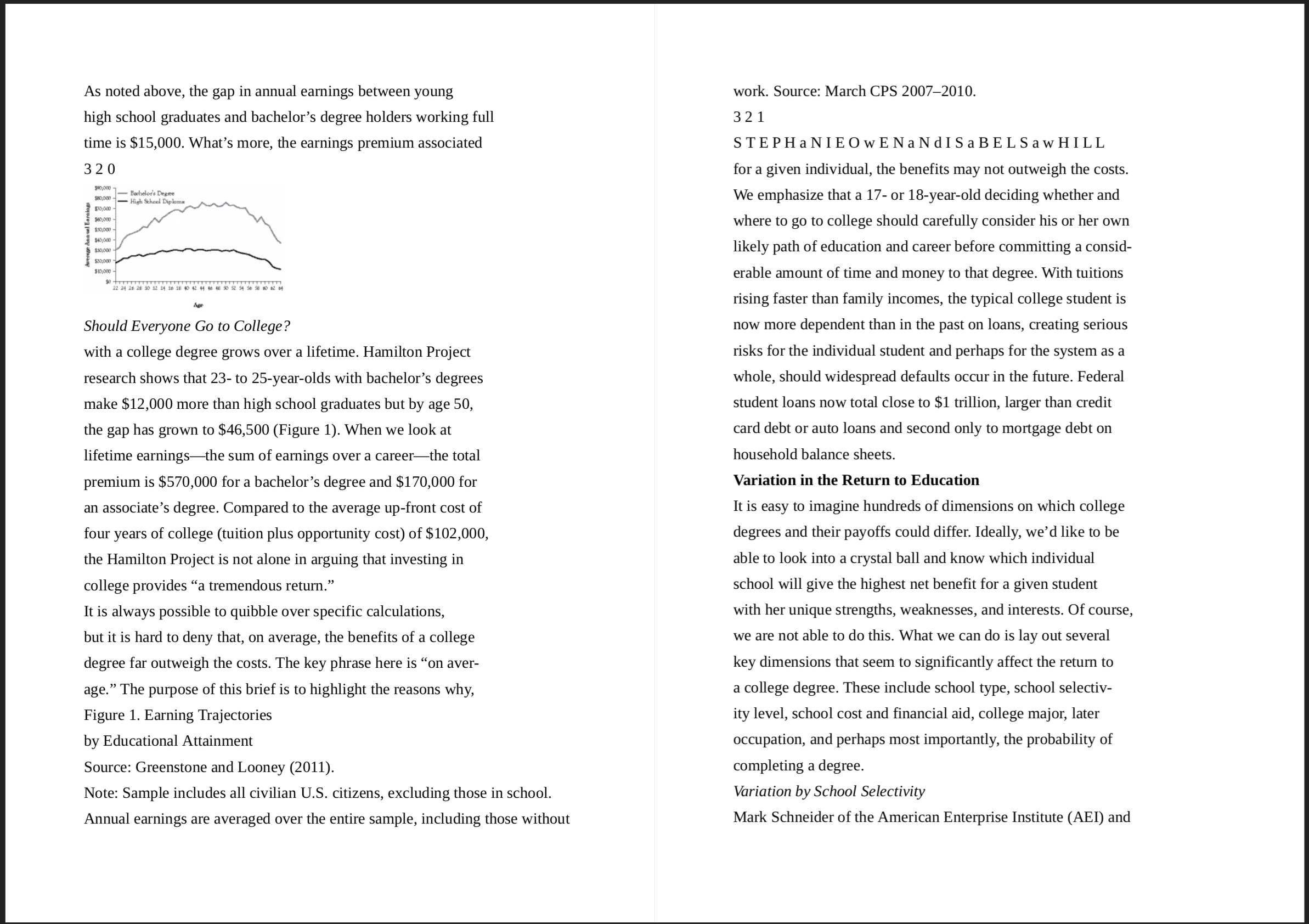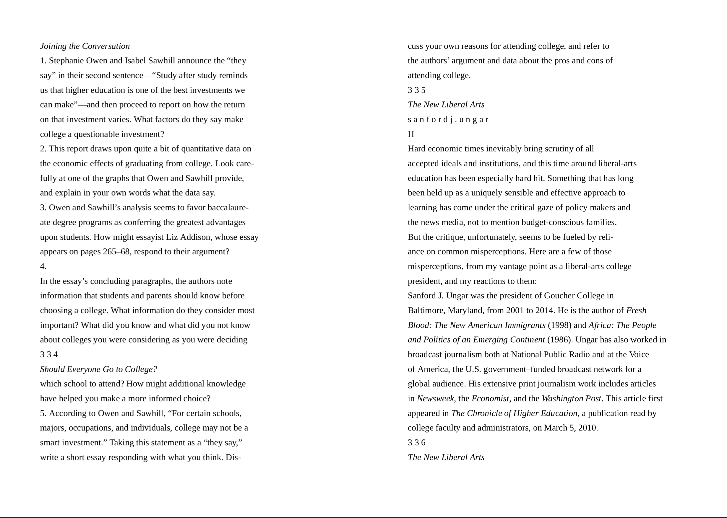 InstructionRead “Should Everyone Go to College?” by Stephanie Owen and Isabel Sawhill on pages 318-335 in They Say, I Say with Readings. In a 2-page essay, answer Question #5 on page 335: According to Owen and Sawhill, “For certain schools, majors, occupations, and individuals, college may not be a smart investment.” Taking this statement as a “they say,” write a 2-page essay responding with what you think. Discuss your own reasons for attending college, and refer to the authors’ argument and data about the pros and cons of attending college. Follow the directions in the module for how to structure the essay. Cite lines from the essay to support your claims. Use MLA formatting directions for quoting lines from the text. - Double Spaced