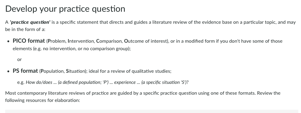 • Ours is a PICOT format. Example of PICO question:In service of patients within the Emergency Medical Services (EMS) (P), does the use of emergency ambulance services in patient transport (I) compared to non-emergency use (C) improve better resource use for enhanced service delivery (O)?