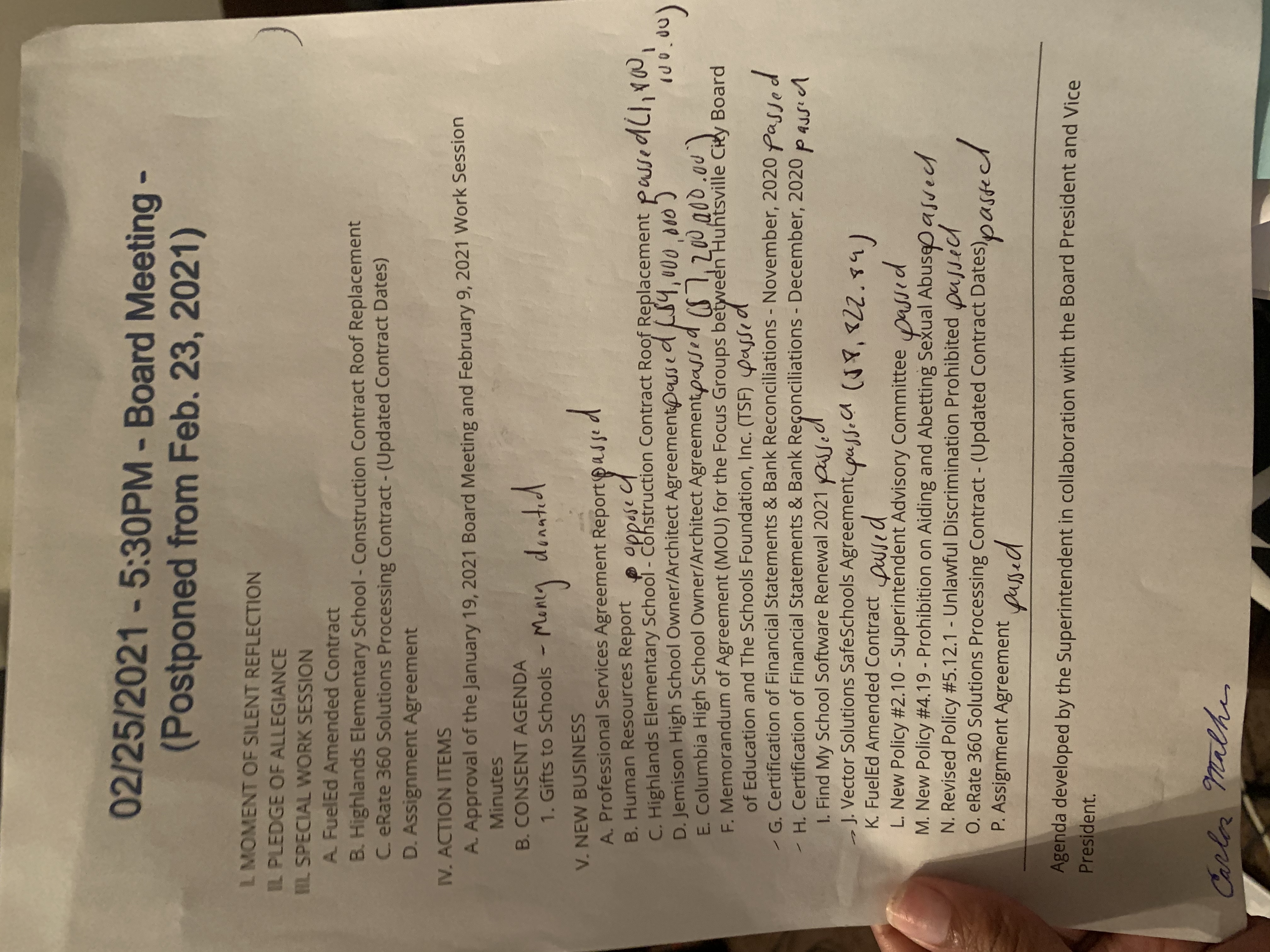 Write a 5 paragraph 1-2 page paper minimum expanding the info provide from Huntsville city school district board meeting answering the 4 questions attached below. Agenda of meeting is also attached