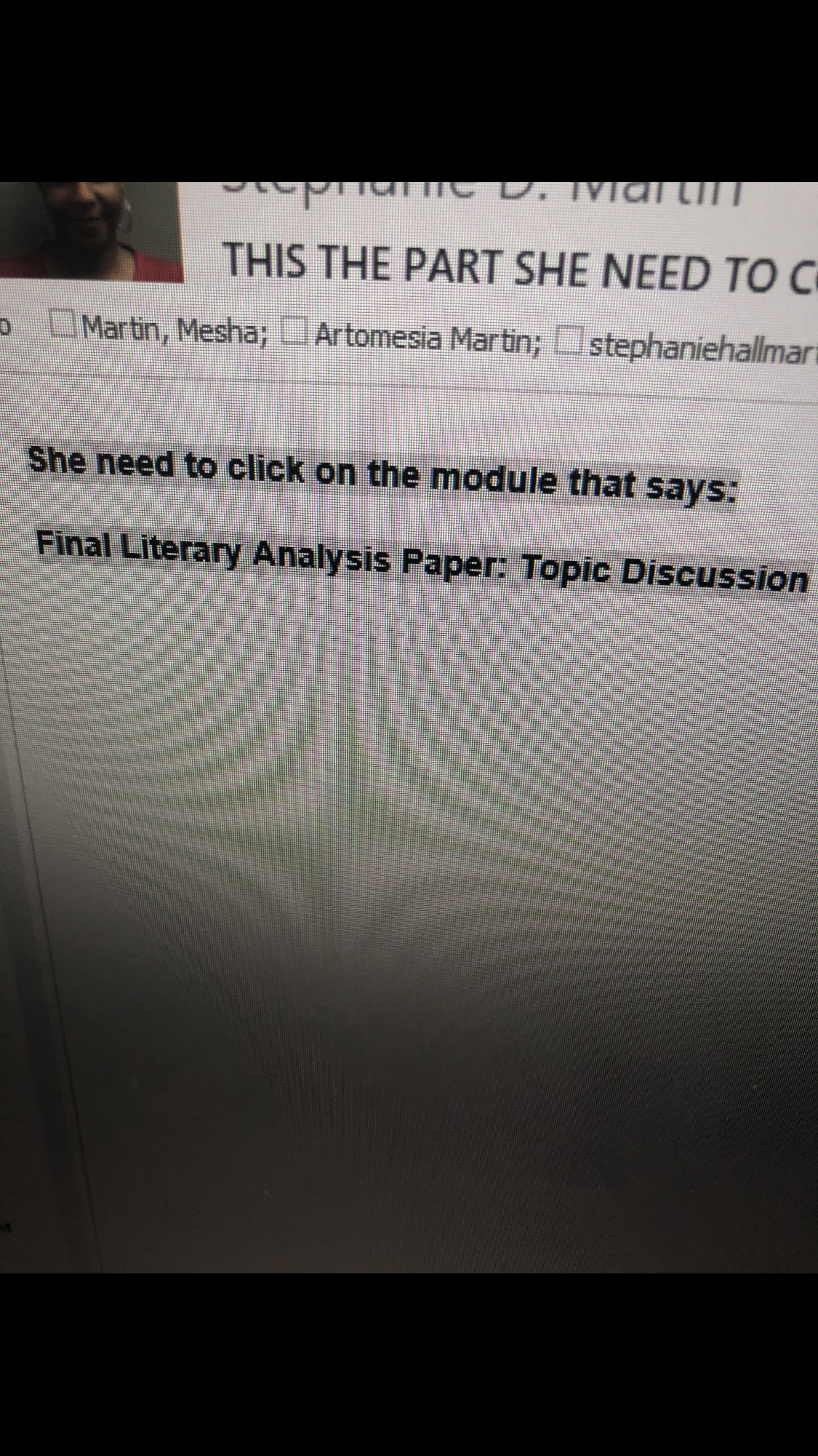 • She didn’t post to my English assignment: Final Analysis Paper: Topic Discussion. It’s due today.