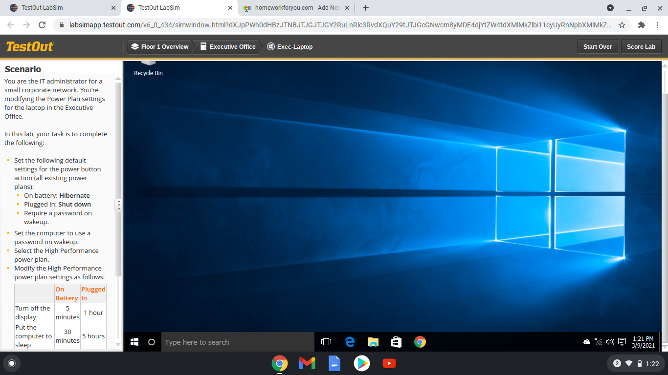 To do Asignments you will need to sign in here: https://labsimapp.testout.com/v6_0_434/index.html/productviewer/242/8.1.7?culture=en-us&startingAction=create I will provide login details you will only need to complete chapter 8 and 9 labs which are specifically listed below.These are Simulated Labs. You will need to complete these online. You will need to solve different scenarios involving Printers and Mobile Devices you must have knowledge about mobile devices and printing /printers this class has to do with Repair. There will be videos to help out. When you have Completed the lab go to score lab it must have a passing score of 100% Example of assignments are in attachment. Chapter 8: Printers 8.1.7 Choose a Printer 8.2.5 Select and Install Printer 8.3.5 Configure Network Printing 8.4.4 Add A Printer 8.4.5 Manage Printing. Chapter 9 Mobile Devices 9.3.5 Edit Power Options 9.3.6 Create a Power Plan 9.6.7 Manage Mobile Devices.