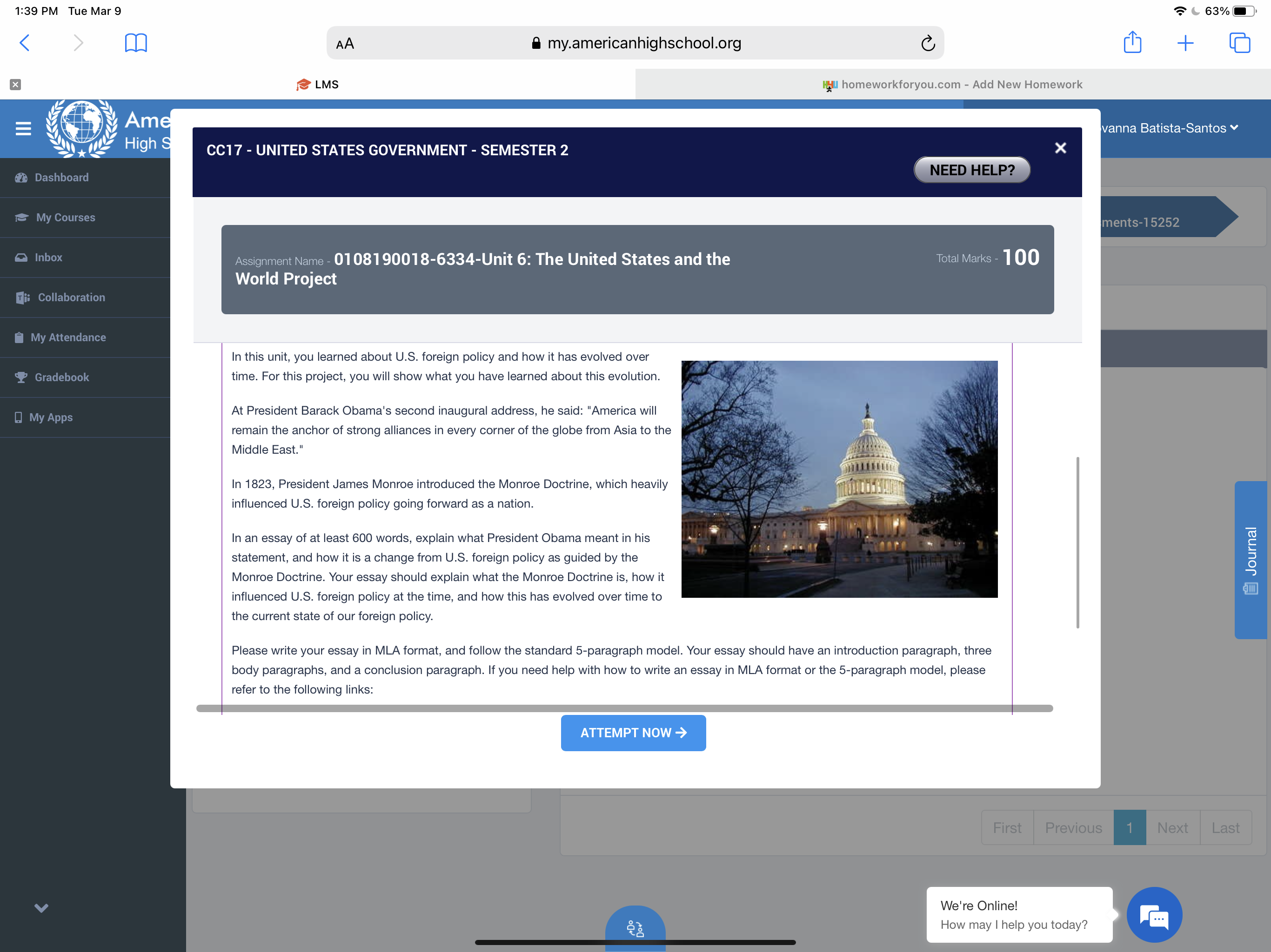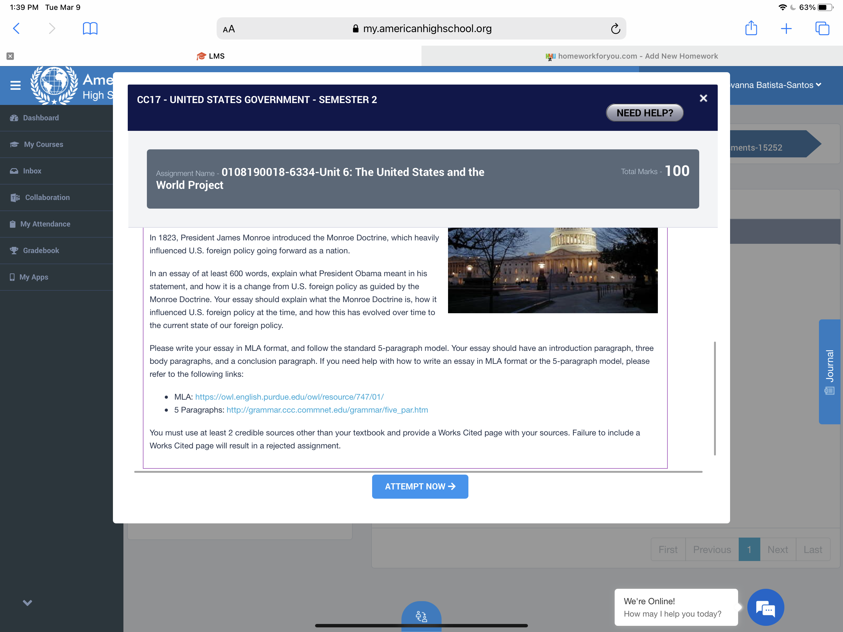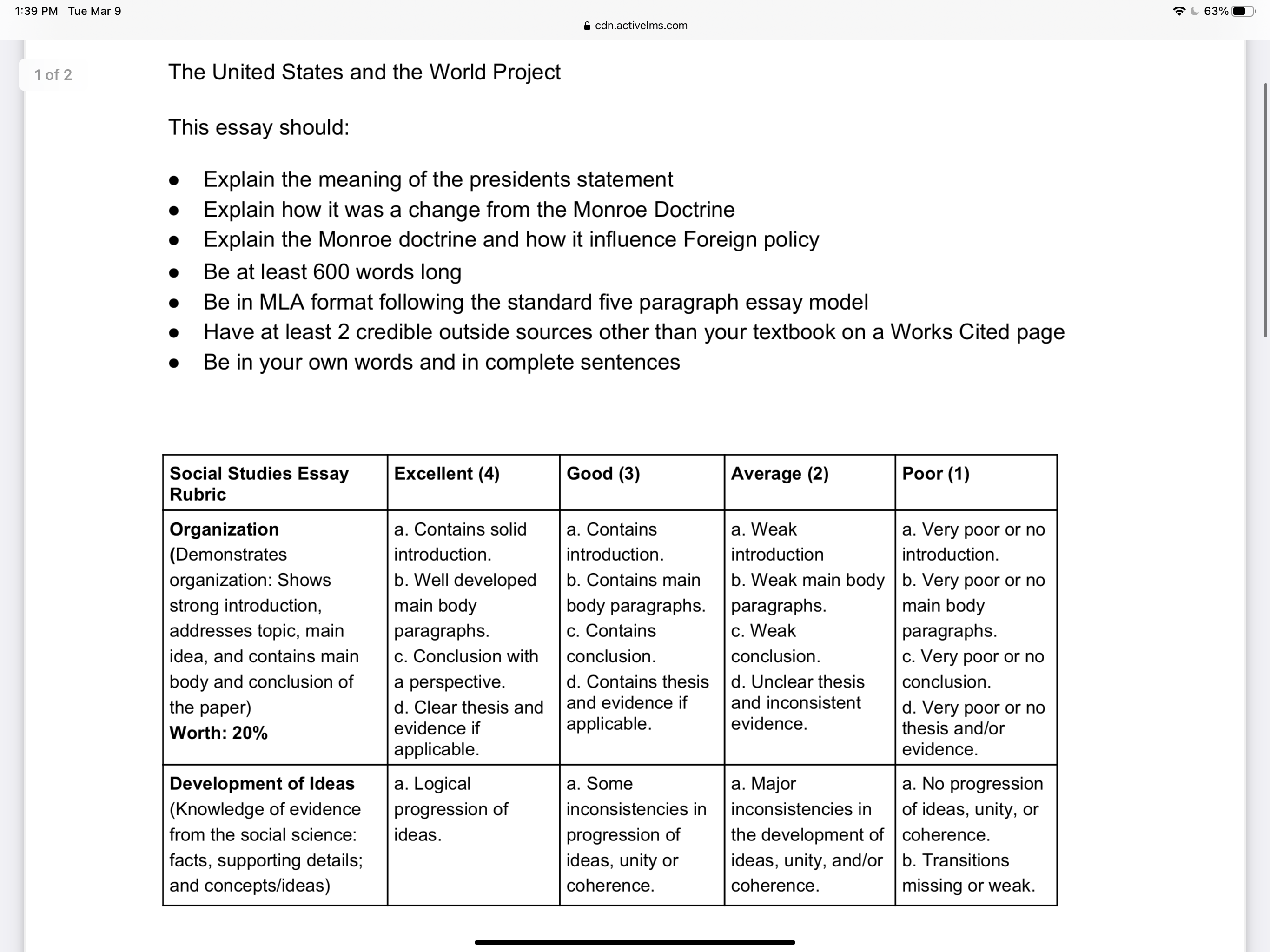 InstructionIn this unit, you learned about U.S. foreign policy and how it has evolved over time. For this project, you will show what you have learned about this evolution. At President Barack Obama's second inaugural address, he said: "America will remain the anchor of strong alliances in every corner of the globe from Asia to the Middle East." In 1823, President James Monroe introduced the Monroe Doctrine, which heavily influenced U.S. foreign policy going forward as a nation. In an essay of at least 600 words, explain what President Obama meant in his statement, and how it is a change from U.S. foreign policy as guided by the Monroe Doctrine. Your essay should explain what the Monroe Doctrine is, how it influenced U.S. foreign policy at the time, and how this has evolved over time to the current state of our foreign policy. Please write your essay in MLA format, and follow the standard 5-paragraph model. Your essay should have an introduction paragraph, three body paragraphs, and a conclusion paragraph. If you need help with how to write an essay in MLA format or the 5-paragraph model, please refer to the following links: MLA: https://owl.english.purdue.edu/owl/resource/747/01/ 5 Paragraphs: http://grammar.ccc.commnet.edu/grammar/five_par.htm You must use at least 2 credible sources other than your textbook and provide a Works Cited page with your sources. Failure to include a Works Cited page will result in a rejected assignment.