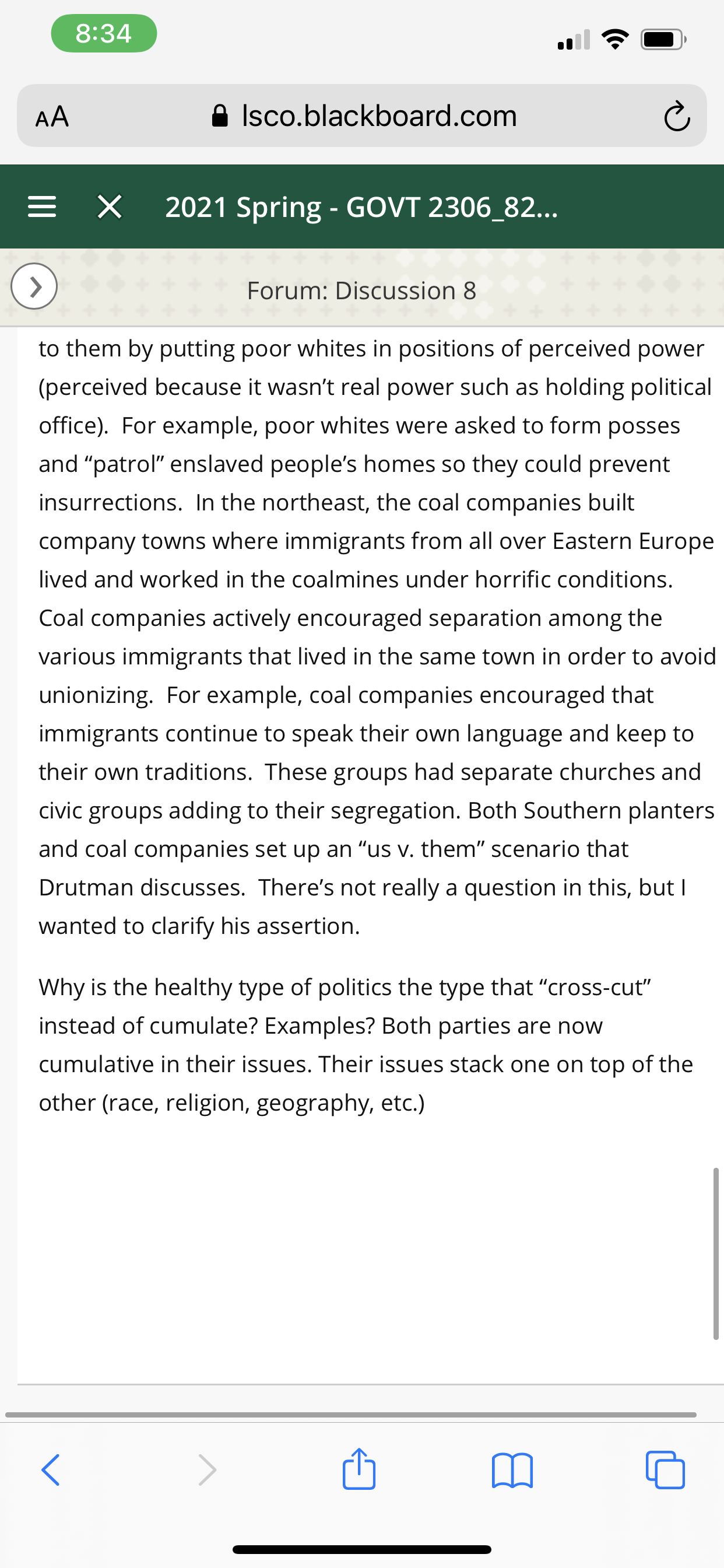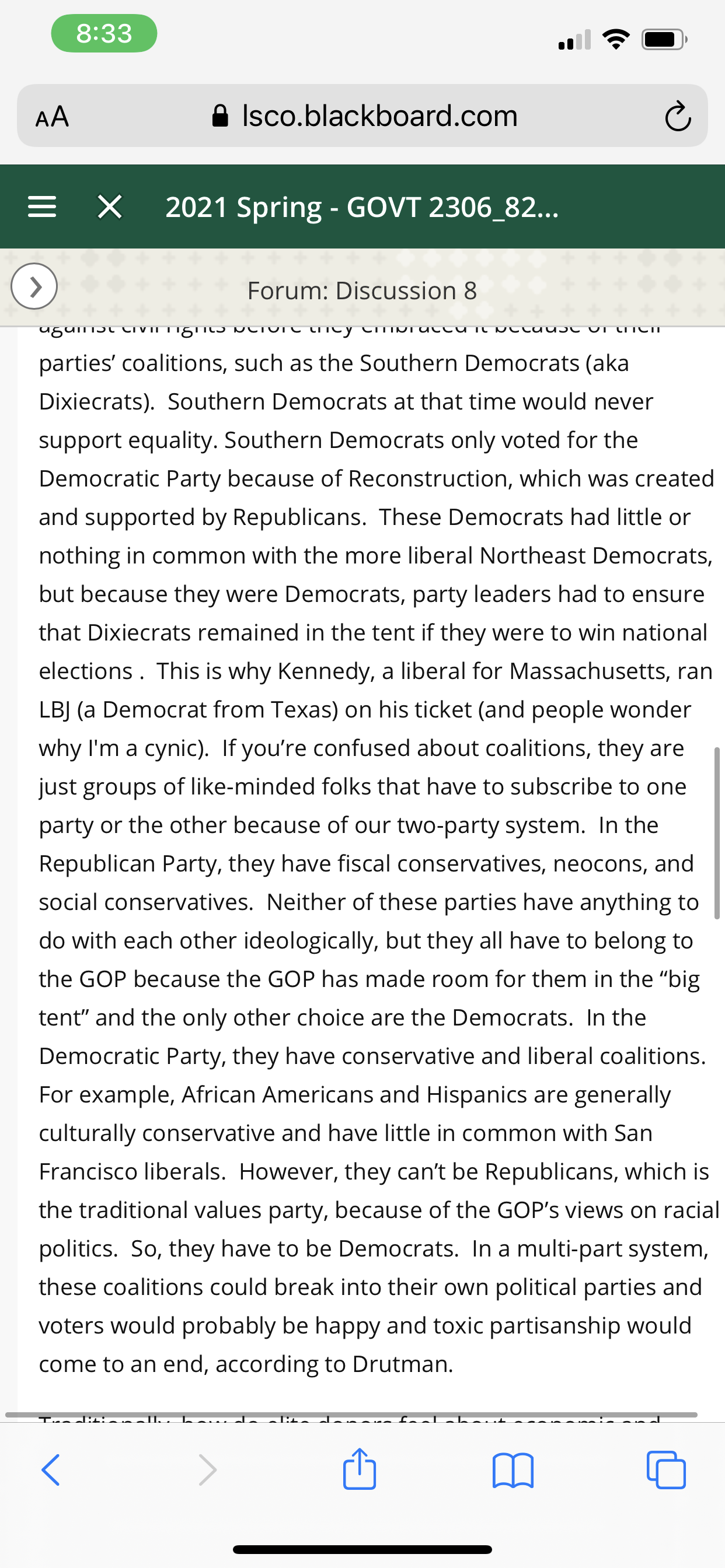 What does Drutman mean by “. . . the issues of commonality are not political issues.”? Why do we need conflict to have a healthy Democracy? Drutman discusses irreconcilable difference and reconcilable differences in politics. Reconcilable differences usually center on economic issues while irreconcilable differences center on identity. Why? Why are economic issues “more solvable” than identity issues? Traditionally, how do elite donors feel about economic and social issues and how does this effect the economic policies of both parties, even the Democrats who say they are on the “little guy’s side”? Why does the average voter depend on their party to “tell them what to think”? Why do independent voters who come to their own conclusions not work in a functioning Democracy? Why do political parties help with this issue? Drutman states that people will vote for their party over their own self economic interests. Examples? Why? How does this contribute to the doom loop? The “two parties have diverged culturally and geographically”, how is this dangerous for Democracy and contribute to the doom loop?
