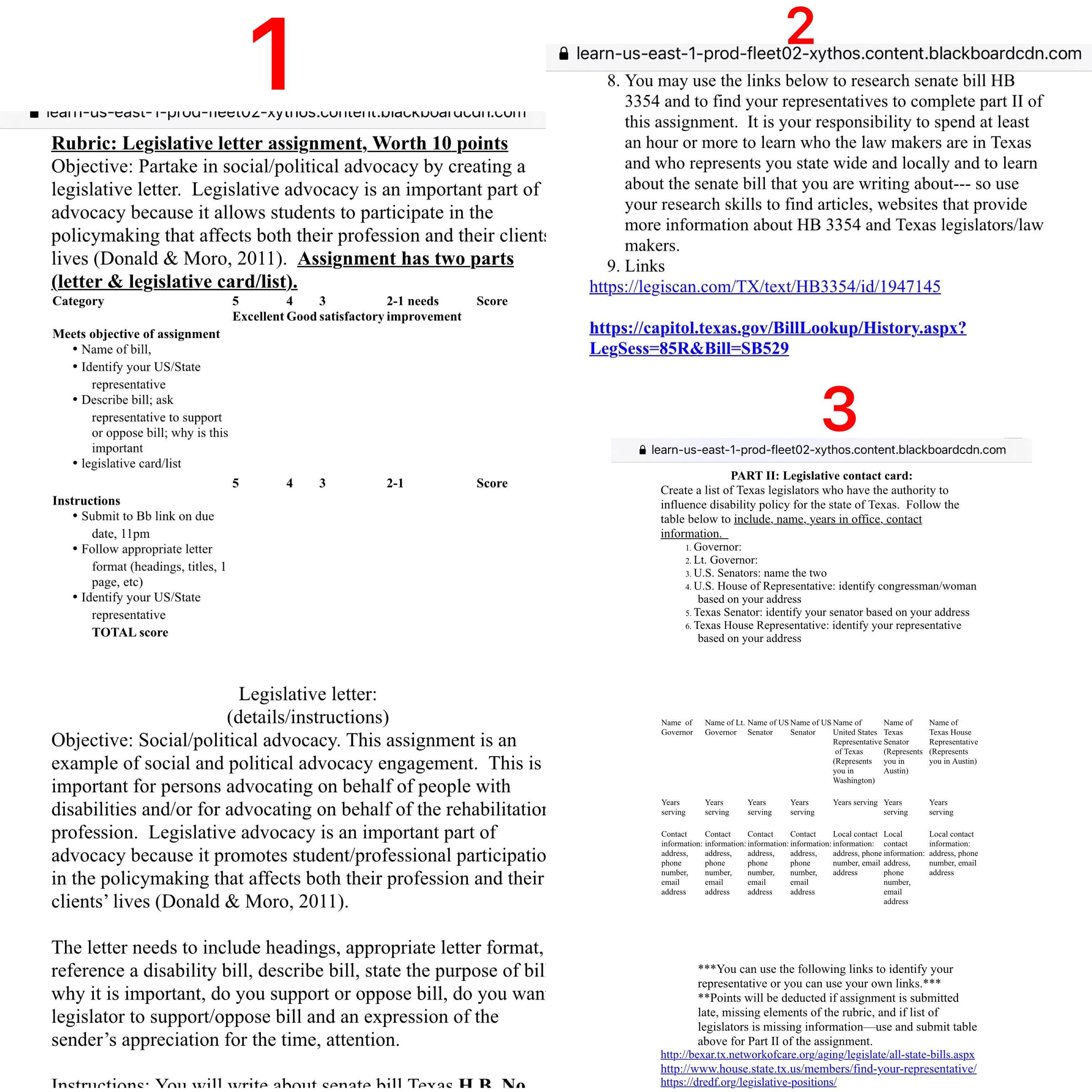 Objective: Partake in social/political advocacy by creating a legislative letter. Assignment has 2 parts (letter and legislative card/list) The letter needs to include headings, appropriate letter format, reference a disability bill, describe bill, state the purpose of bill, why it is important, do you support or oppose bill, do you want legislator to support or oppose bill and an expression of the senders appreciation for the time, attention.