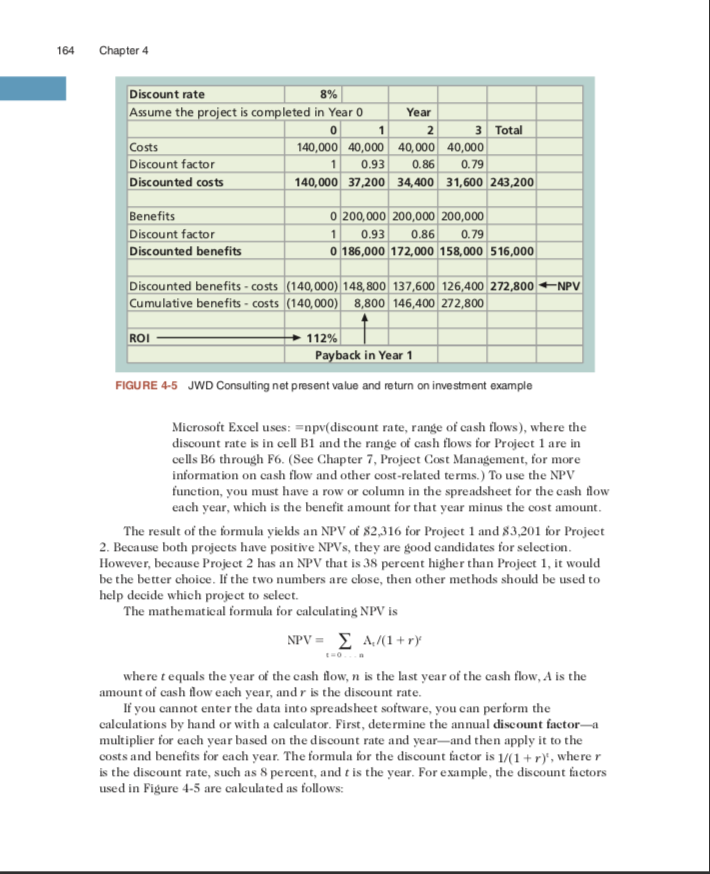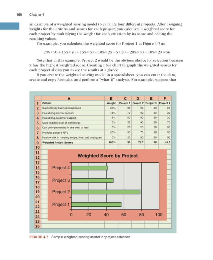 InstructionComplete the assignment using spreadsheet software to create the following: Make sure your formulas work correctly 1.) Perform a financial analysis for a project using the format provided in Figure 4-5. Assume that the projected costs and benefits for this project are spread over four years as follows: Estimated costs are $300,000 in Year 1 and $40,000 each year in Years 2, 3, and 4. Estimated benefits are $0 in Year 1 and $120,000 each year in Years 2, 3, and 4. Use a 7 percent discount rate, and round the discount factors to two decimal places. Create a spreadsheet or use the business case financials template on the Companion website to calculate and clearly display the NPV, ROI, and year in which payback occurs. In addition, write a paragraph explaining whether you would recommend investing in this project, based on your financial analysis. 2.) Create a weighted scoring model to determine grades for a course. Final grades are based on three exams worth 15 percent, 15 percent, and 25 percent, respectively; homework is worth 15 percent; and a group project is worth 30 percent. Enter scores for three students. Assume that Student 1 earns 100 percent (or 100) on every item. Assume that Student 2 earns 70 percent on each of the exams, 80 percent on the homework, and 95 percent on the group project. Assume that Student 3 earns 90 percent on Exam 1, 80 percent on Exam 2, 75 percent on Exam 3, 80 percent on the homework, and 70 percent on the group project. You can use the weighted scoring model template, create your own spreadsheet, or make the matrix by hand.