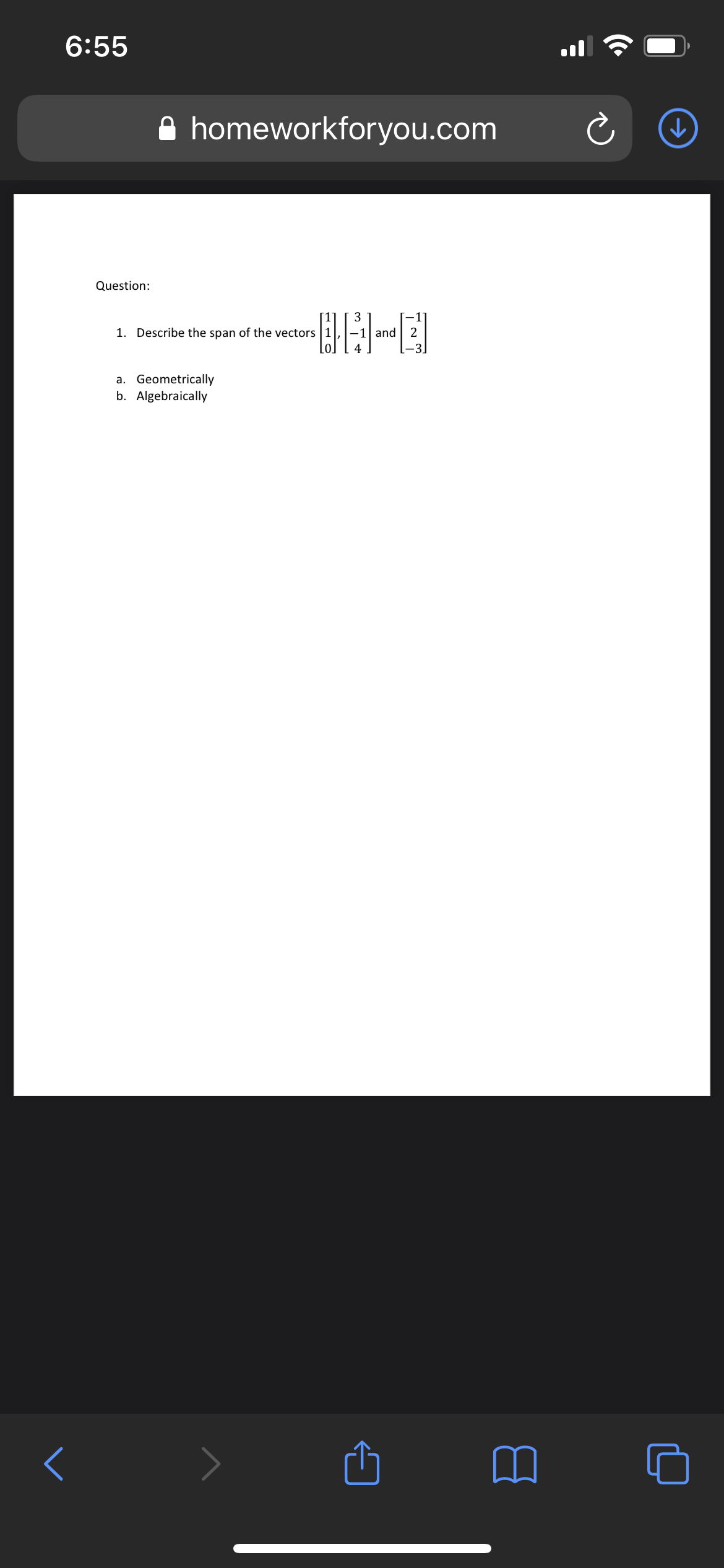 I will upload one question at a time as I can only see one question at a time as well. There is only a total of 3 questions. I will post one at a time, after I get the answer, I will post the next question. Bonus may be offered at the end of the assignment. THIS IS A UNIVERSITY LINEAR ALGEBRA COURSE. KNOWLEDGE OF THE SUBJECT IS REQUIRED!