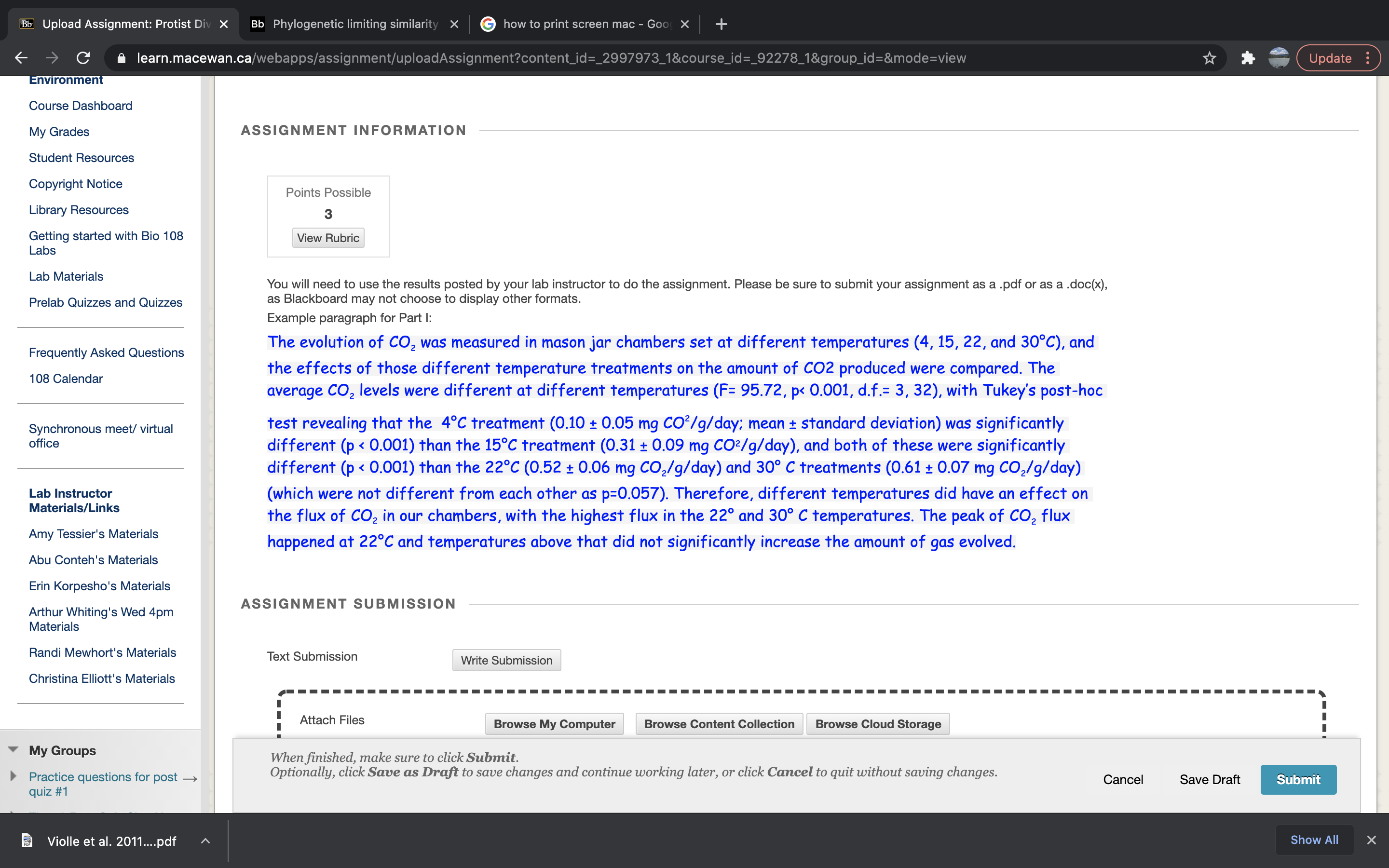 Finish the lab report. The first part is to make a graph using the data I have provided and the assignment goes over what time of graph that has to be made. You will continue with writing a short paragraph discussing the results based on ideas of natural selection and diverse species of protists. The second part requires you to read an article and do a scientific article reflection; all the instructions are in the lab assignment that is attach. A screenshot of the data is attached, a screenshot of an example paragraph is attached for part one as well.