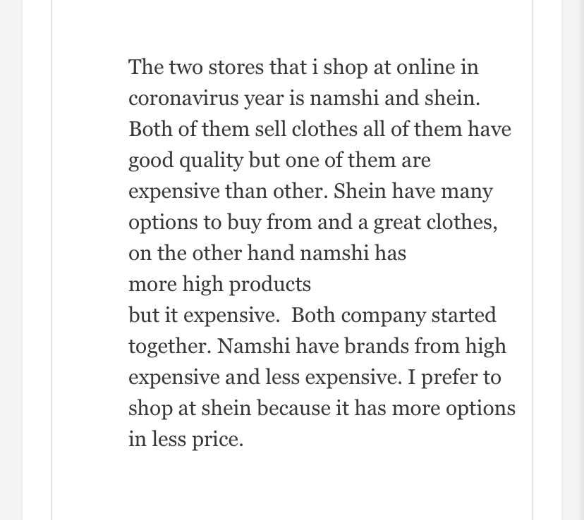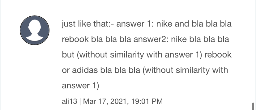• just like that:- answer 1: nike and bla bla bla rebook bla bla bla answer2: nike bla bla bla but (without similarity with answer 1) rebook or adidas bla bla bla (without similarity with answer 1)