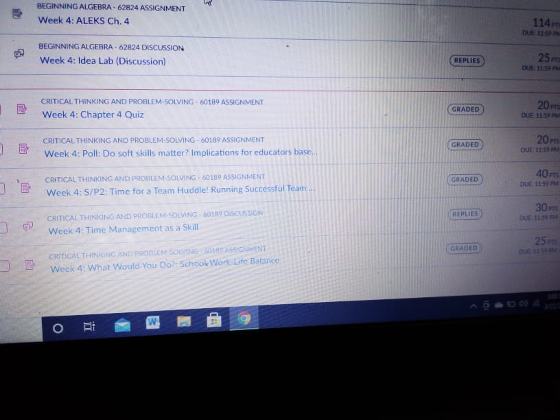 I just have a few discussion and a few quizzes. It's algebra and critical thinking. it's mainly reading a topic and discussing about it or answering questions. Then we have to reply to 3 different students but on three different days.