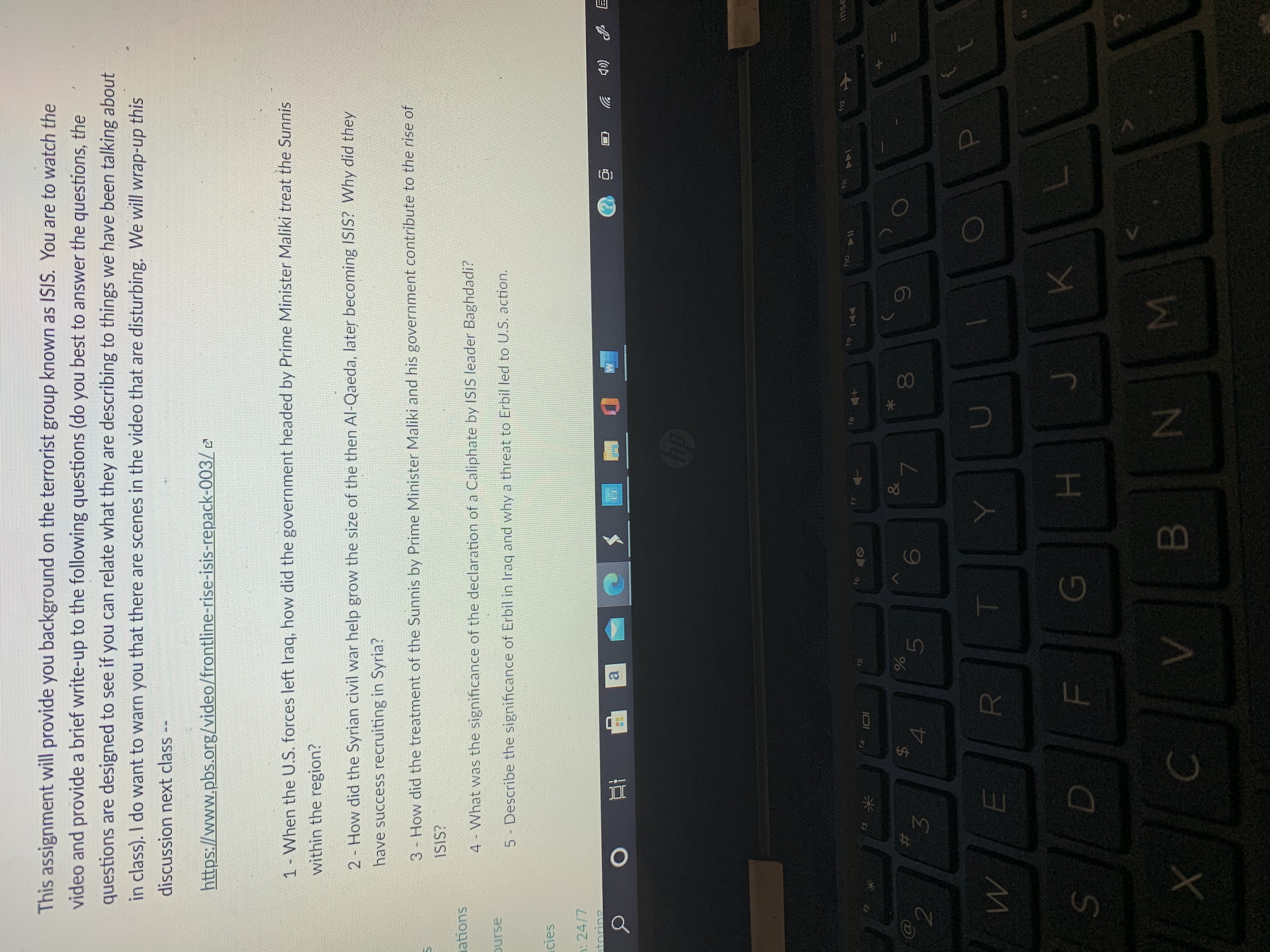 Video Https://www.pbs.org/video/frontline-rise-isis-repack-003/ 1) when the U.S forces left Iraq, how did the government headed by Prime Minister Maliki treat the Sunnis within the region? 2) How did the Syrian civil war help grow the size of the then al-Qaeda, later becoming ISIS? Why did they have success recruiting In Syria? 3) How did the treatment of the Sunnis by prime Minister Maliki and his government contribute to the rise of ISIS? 4) What was the significance of the declaration of a Caliphate by ISIS leader Baghdadi? 5) Describe the significance of Erbil in Iraq and why a threat to Erbil led to U.S action