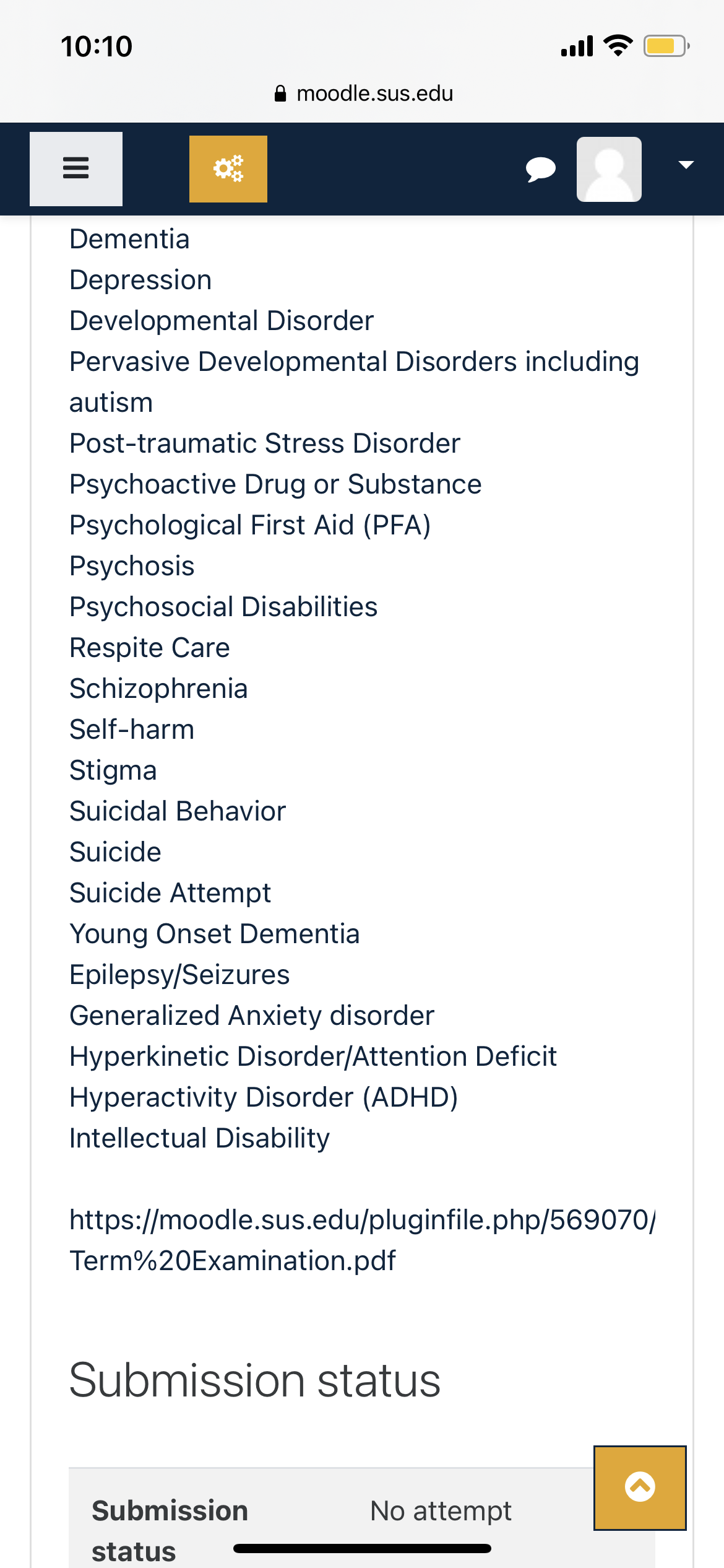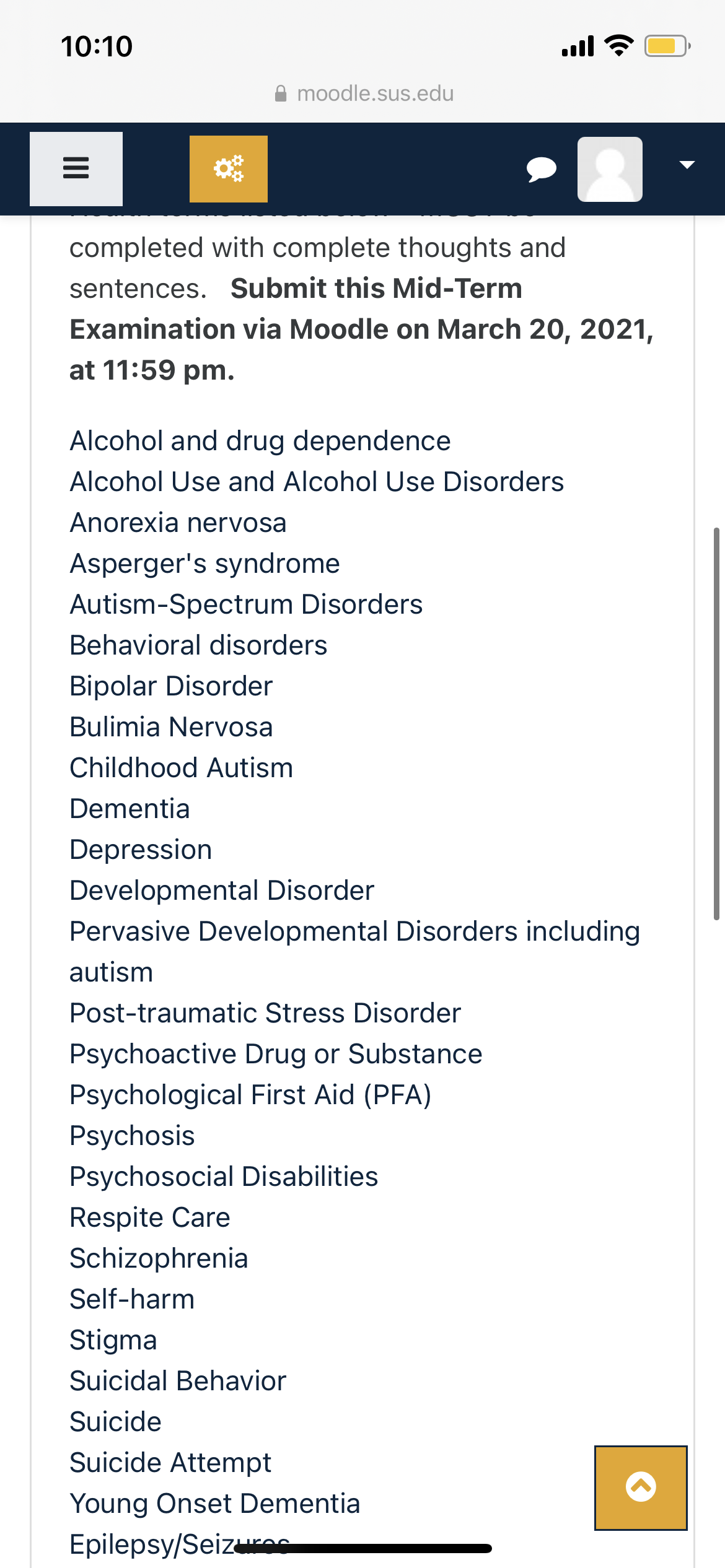 Instructions: Define the following Mental Health terms listed below - MUST be completed with complete thoughts and sentences. Alcohol and drug dependence Alcohol Use and Alcohol Use Disorders Anorexia nervosa Asperger's syndrome Autism-Spectrum Disorders Behavioral disorders Bipolar Disorder Bulimia Nervosa Childhood Autism Dementia Depression Developmental Disorder Pervasive Developmental Disorders including autism Post-traumatic Stress Disorder Psychoactive Drug or Substance Psychological First Aid (PFA) Psychosis Psychosocial Disabilities Respite Care Schizophrenia Self-harm Stigma Suicidal Behavior Suicide Suicide Attempt Young Onset Dementia Epilepsy/Seizures Generalized Anxiety disorder Hyperkinetic Disorder/Attention Deficit Hyperactivity Disorder (ADHD) Intellectual Disability