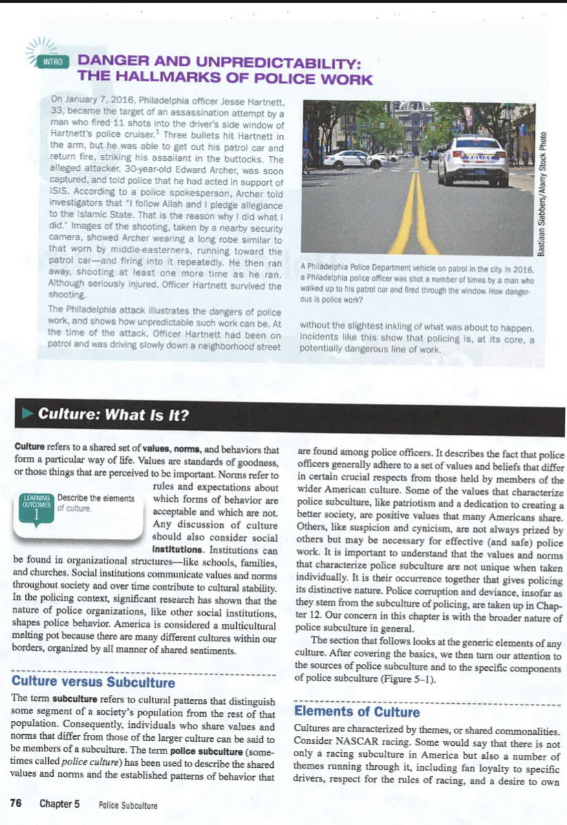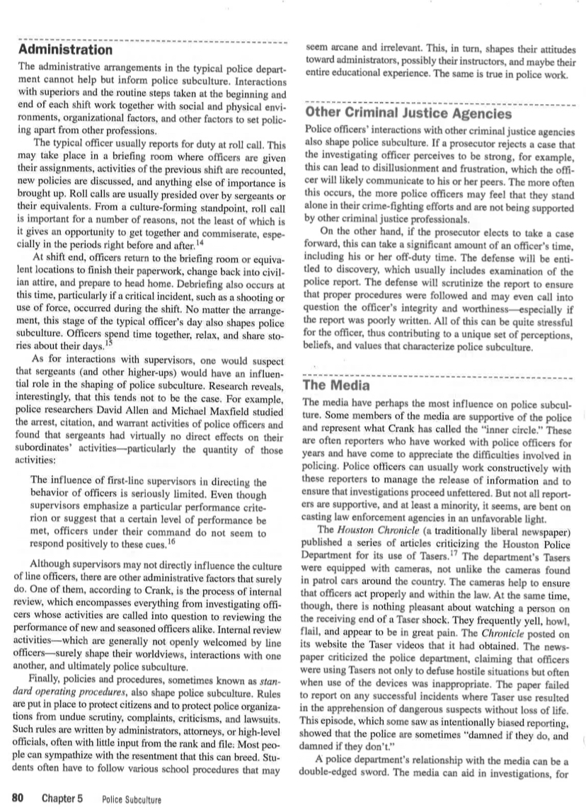 • I uploaded 7 pages, Police Subculture is called. From page 76 to 81. Read it and write your OPINION, 2 to 3 paragraph. Use quote only from the reading. I need it in 20 hours.