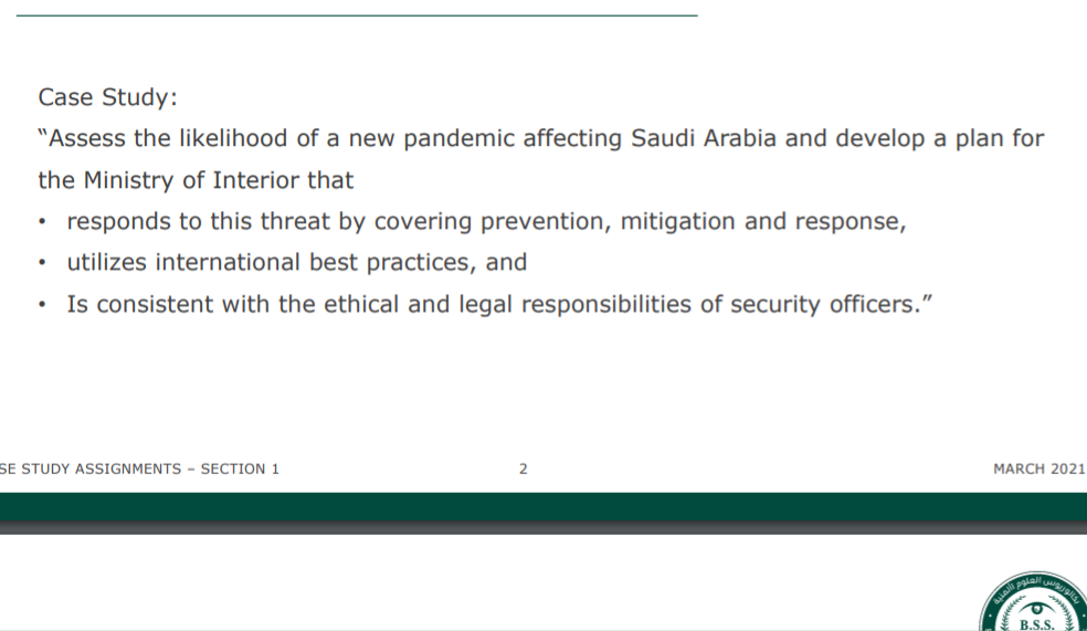 I'm working on a criminal justice case study and need a sample draft to help me study. Case Study: “Assess the likelihood of a new pandemic affecting Saudi Arabia and develop a plan for the Ministry of Interior that • responds to this threat by covering prevention, mitigation and response, • utilizes international best practices, and • Is consistent with the ethical and legal responsibilities of security officers.” Use the model attached to solve this assignment Requirements: 1000-1500