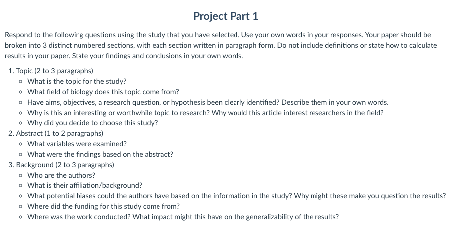 Respond to the following questions using the study that you have selected. Use your own words in your responses. Your paper should be broken into 3 distinct numbered sections, with each section written in paragraph form. Do not include definitions or state how to calculate results in your paper. State your findings and conclusions in your own words. Topic (2 to 3 paragraphs) What is the topic for the study? What field of biology does this topic come from? Have aims, objectives, a research question, or hypothesis been clearly identified? Describe them in your own words. Why is this an interesting or worthwhile topic to research? Why would this article interest researchers in the field? Why did you decide to choose this study? Abstract (1 to 2 paragraphs) What variables were examined? What were the findings based on the abstract? Background (2 to 3 paragraphs) Who are the authors? What is their affiliation/background? What potential biases could the authors have based on the information in the study? Why might these make you question the results? Where did the funding for this study come from? Where was the work conducted? What impact might this have on the generalizability of the results?