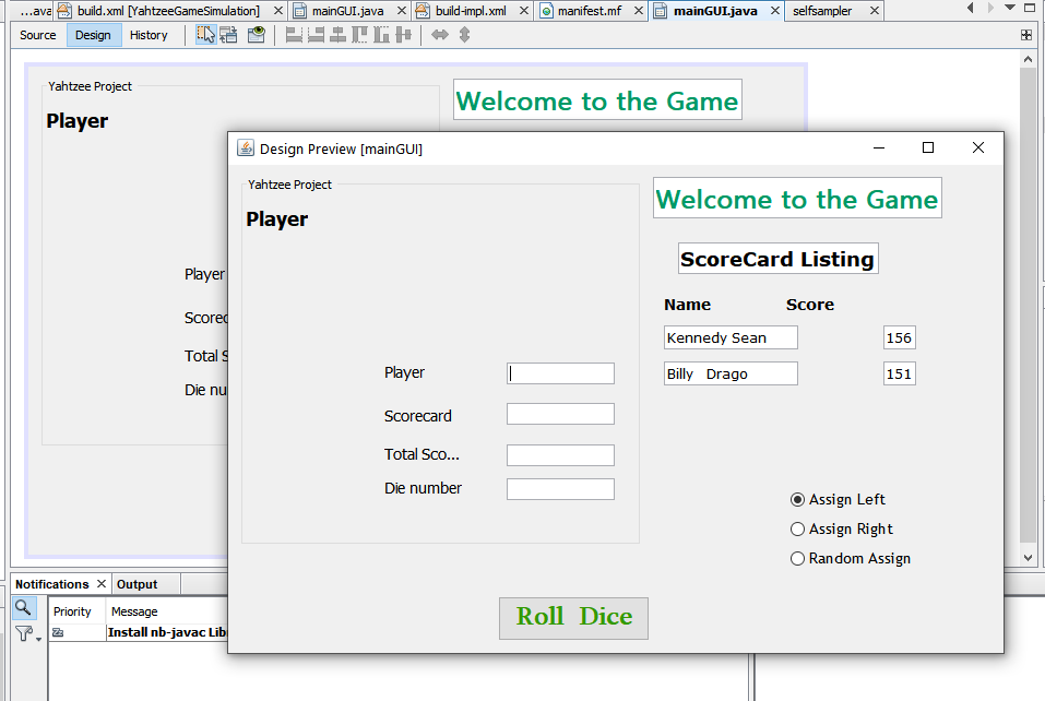 • My trouble is not with the Yahtzee code or the GUI window it was getting them to work together that what I was inquiring when I asked the question, perhaps I should have clarified more. Is there any way youd still be able to help me out?