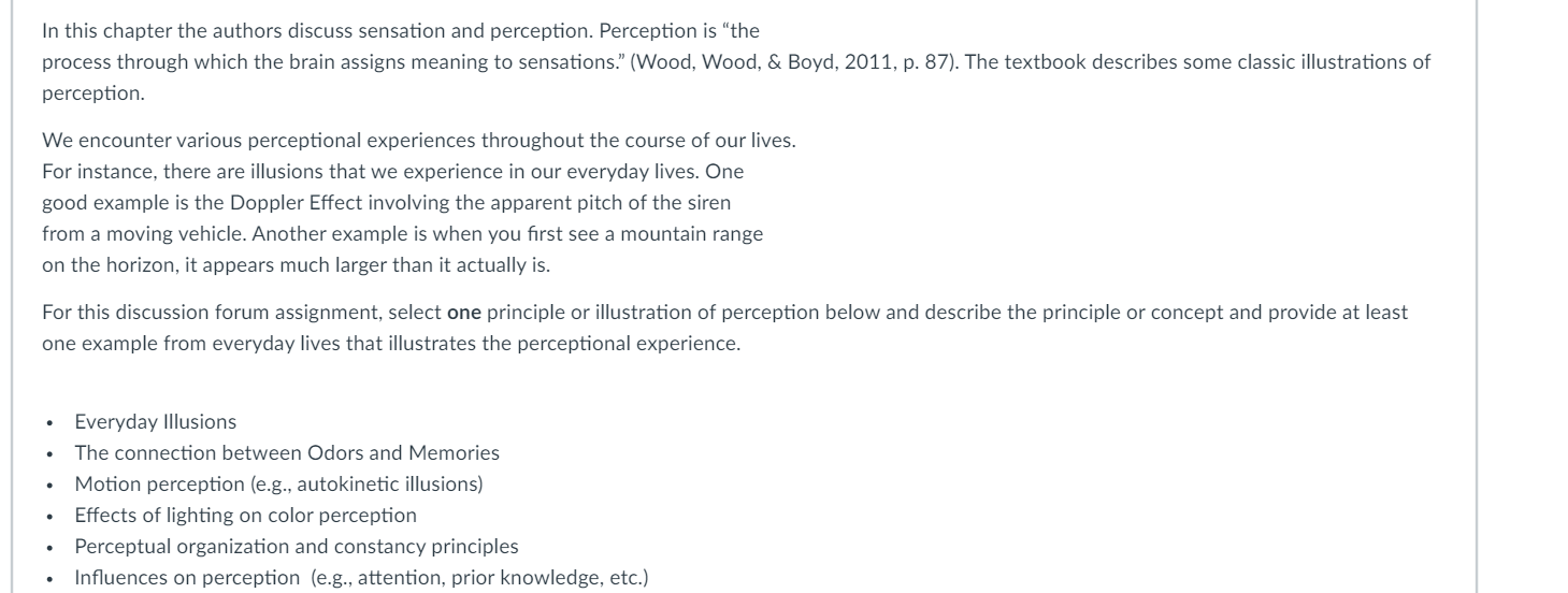 • that's the question that you have to answer. For this discussion forum assignment, select one principle or illustration of perception below and describe the principle or concept and provide at least one example from everyday lives that illustrates the perceptional experience. you pick one of these for each page: Everyday Illusions. The connection between Odors and Memories. Motion perception (e.g., autokinetic illusions). Effects of lighting on color perception. Perceptual organization and constancy principles. Influences on perception (e.g., attention, prior knowledge, etc.).