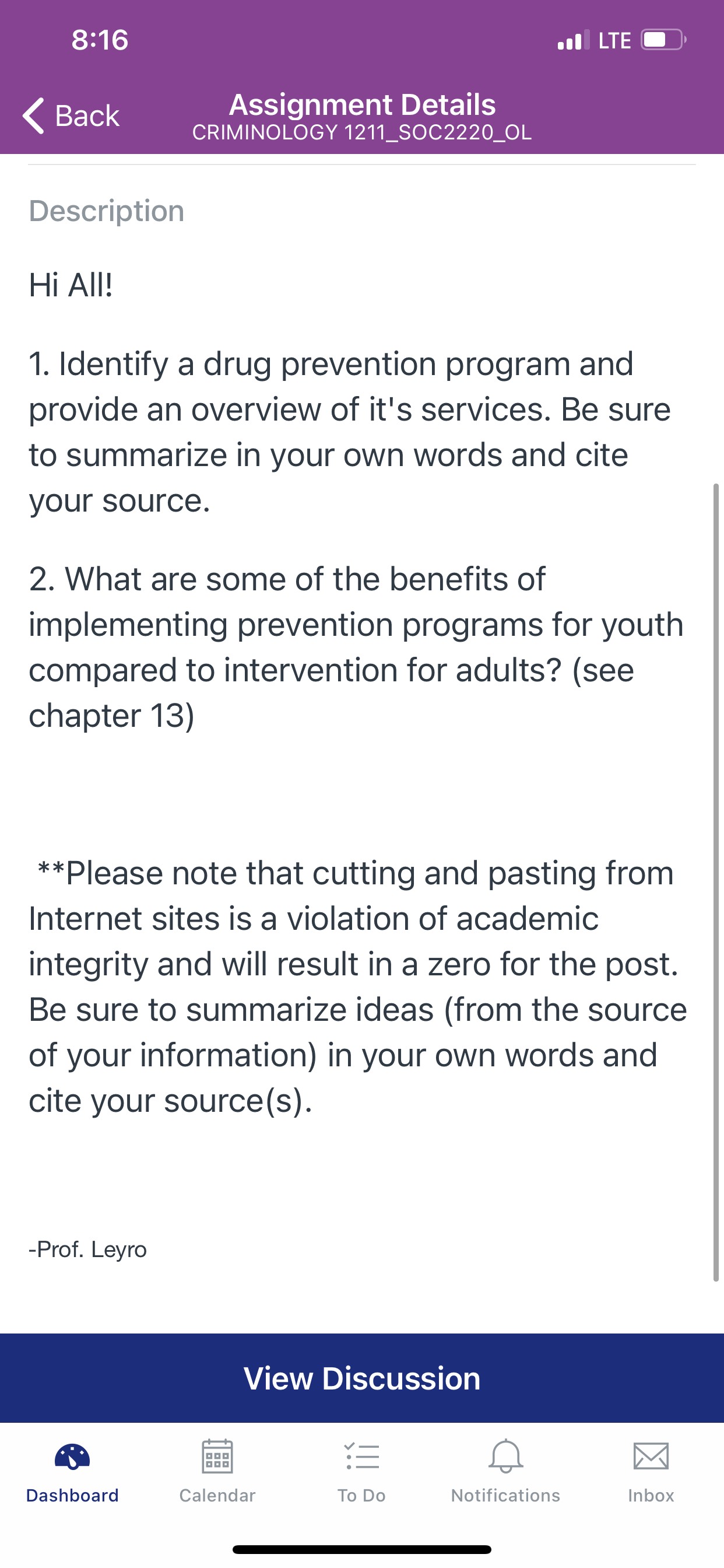 1. Identify a drug prevention program and provide an overview of its services. Be sure to summarize in your own words and cite your source. 2. What are some of the benefits of implementing prevention programs for youth compared to intervention for adults? **Please note that cutting and pasting from Internet sites is a violation of academic integrity and will result in a zero for the post. Be sure to summarize ideas (from the source of your information) in your own words and cite your source(s). Each question has to have 10 sentences each.