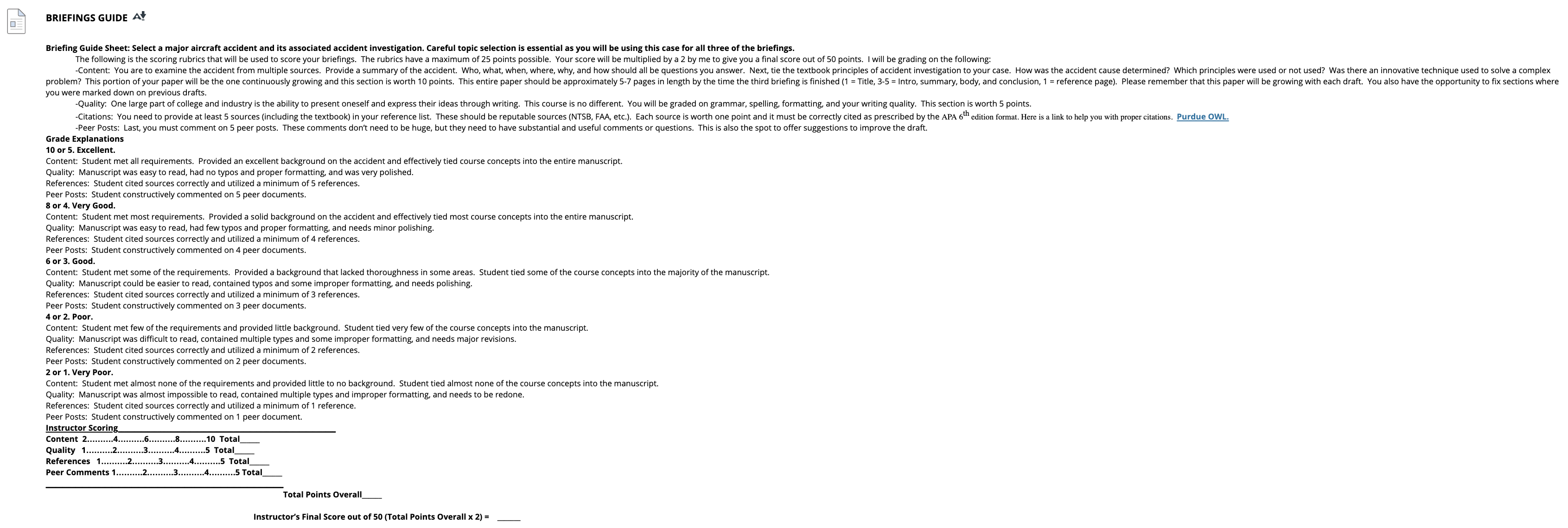 InstructionBriefing Guide Sheet: Select a major aircraft accident and its associated accident investigation. Careful topic selection is essential as you will be using this case for all three of the briefings. The following is the scoring rubrics that will be used to score your briefings. The rubrics have a maximum of 25 points possible. Your score will be multiplied by a 2 by me to give you a final score out of 50 points. I will be grading on the following: -Content: You are to examine the accident from multiple sources. Provide a summary of the accident. Who, what, when, where, why, and how should all be questions you answer. Next, tie the textbook principles of accident investigation to your case. How was the accident cause determined? Which principles were used or not used? Was there an innovative technique used to solve a complex problem? This portion of your paper will be the one continuously growing and this section is worth 10 points. This entire paper should be approximately 5-7 pages in length by the time the third briefing is finished (1 = Title, 3-5 = Intro, summary, body, and conclusion, 1 = reference page). Please remember that this paper will be growing with each draft. You also have the opportunity to fix sections where you were marked down on previous drafts. -Quality: One large part of college and industry is the ability to present oneself and express their ideas through writing. This course is no different. You will be graded on grammar, spelling, formatting, and your writing quality. This section is worth 5 points. -Citations: You need to provide at least 5 sources (including the textbook) in your reference list. These should be reputable sources (NTSB, FAA, etc.). Each source is worth one point and it must be correctly cited as prescribed by the APA 6th edition format. Here is a link to help you with proper citations. Purdue OWL. -Peer Posts: Last, you must comment on 5 peer posts. These comments don’t need to be huge, but they need to have substantial and useful comments or questions. This is also the spot to offer suggestions to improve the draft. Grade Explanations 10 or 5. Excellent. Content: Student met all requirements. Provided an excellent background on the accident and effectively tied course concepts into the entire manuscript. Quality: Manuscript was easy to read, had no typos and proper formatting, and was very polished. References: Student cited sources correctly and utilized a minimum of 5 references. Peer Posts: Student constructively commented on 5 peer documents. 8 or 4. Very Good. Content: Student met most requirements. Provided a solid background on the accident and effectively tied most course concepts into the entire manuscript. Quality: Manuscript was easy to read, had few typos and proper formatting, and needs minor polishing. References: Student cited sources correctly and utilized a minimum of 4 references. Peer Posts: Student constructively commented on 4 peer documents. 6 or 3. Good. Content: Student met some of the requirements. Provided a background that lacked thoroughness in some areas. Student tied some of the course concepts into the majority of the manuscript. Quality: Manuscript could be easier to read, contained typos and some improper formatting, and needs polishing. References: Student cited sources correctly and utilized a minimum of 3 references. Peer Posts: Student constructively commented on 3 peer documents. 4 or 2. Poor. Content: Student met few of the requirements and provided little background. Student tied very few of the course concepts into the manuscript. Quality: Manuscript was difficult to read, contained multiple types and some improper formatting, and needs major revisions. References: Student cited sources correctly and utilized a minimum of 2 references. Peer Posts: Student constructively commented on 2 peer documents. 2 or 1. Very Poor. Content: Student met almost none of the requirements and provided little to no background. Student tied almost none of the course concepts into the manuscript. Quality: Manuscript was almost impossible to read, contained multiple types and improper formatting, and needs to be redone. References: Student cited sources correctly and utilized a minimum of 1 reference. Peer Posts: Student constructively commented on 1 peer document.