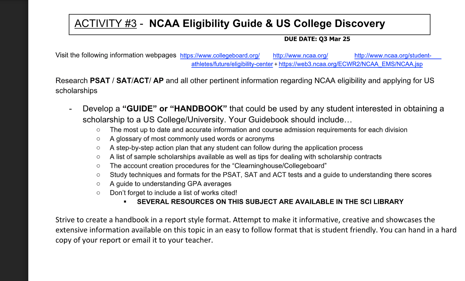 Research PSAT / SAT/ACT/ AP and all other pertinent information regarding NCAA eligibility and applying for US scholarships - Develop a “GUIDE” or “HANDBOOK” that could be used by any student interested in obtaining a scholarship to a US College/University. Your Guidebook should include… o The most up to date and accurate information and course admission requirements for each division o A glossary of most commonly used words or acronyms o A step-by-step action plan that any student can follow during the application process o A list of sample scholarships available as well as tips for dealing with scholarship contracts o The account creation procedures for the “Clearninghouse/Collegeboard” o Study techniques and formats for the PSAT, SAT and ACT tests and a guide to understanding there scores o A guide to understanding GPA averages o Don’t forget to include a list of works cited!  SEVERAL RESOURCES ON THIS SUBJECT ARE AVAILABLE IN THE SCI LIBRARY Strive to create a handbook in a report style format. Attempt to make it informative, creative and showcases the extensive information available on this topic in an easy to follow format that is student friendly. You can hand in a hard copy of your report or email it to your teacher.