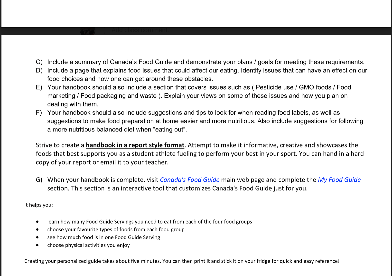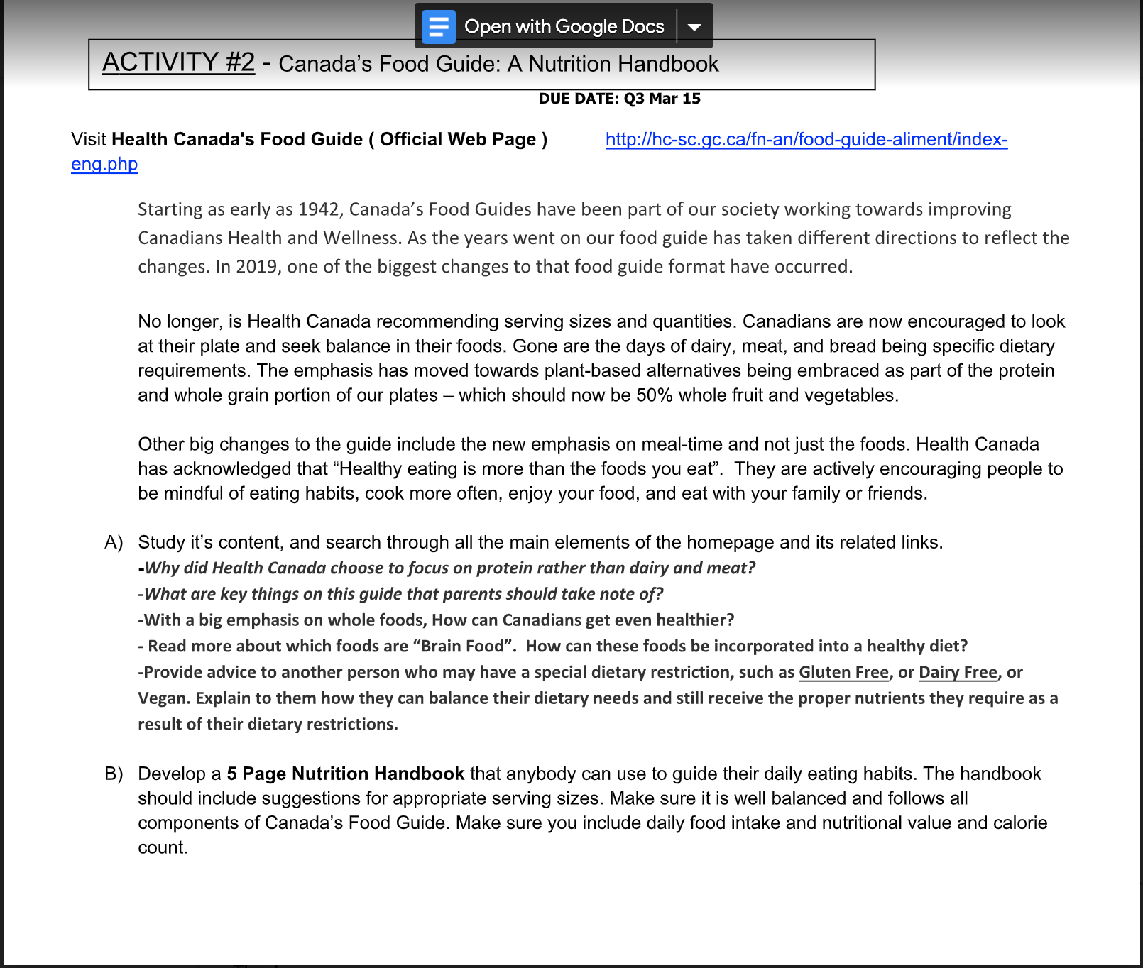 InstructionStarting as early as 1942, Canada’s Food Guides have been part of our society working towards improving Canadians Health and Wellness. As the years went on our food guide has taken different directions to reflect the changes. In 2019, one of the biggest changes to that food guide format have occurred. No longer, is Health Canada recommending serving sizes and quantities. Canadians are now encouraged to look at their plate and seek balance in their foods. Gone are the days of dairy, meat, and bread being specific dietary requirements. The emphasis has moved towards plant-based alternatives being embraced as part of the protein and whole grain portion of our plates – which should now be 50% whole fruit and vegetables. Other big changes to the guide include the new emphasis on meal-time and not just the foods. Health Canada has acknowledged that “Healthy eating is more than the foods you eat”. They are actively encouraging people to be mindful of eating habits, cook more often, enjoy your food, and eat with your family or friends. A) Study it’s content, and search through all the main elements of the homepage and its related links. -Why did Health Canada choose to focus on protein rather than dairy and meat? -What are key things on this guide that parents should take note of? -With a big emphasis on whole foods, How can Canadians get even healthier? - Read more about which foods are “Brain Food”. How can these foods be incorporated into a healthy diet? -Provide advice to another person who may have a special dietary restriction, such as Gluten Free, or Dairy Free, or Vegan. Explain to them how they can balance their dietary needs and still receive the proper nutrients they require as a result of their dietary restrictions. B) Develop a 5 Page Nutrition Handbook that anybody can use to guide their daily eating habits. The handbook should include suggestions for appropriate serving sizes. Make sure it is well balanced and follows all components of Canada’s Food Guide. Make sure you include daily food intake and nutritional value and calorie count. 11 PAI 3OP ACTIVITY #1 - Categories of Physical Fitness & Components of Health ACTIVITY #2 - Canada’s Food Guide: A Nutrition Handbook C) Include a summary of Canada’s Food Guide and demonstrate your plans / goals for meeting these requirements. D) Include a page that explains food issues that could affect our eating. Identify issues that can have an effect on our food choices and how one can get around these obstacles. E) Your handbook should also include a section that covers issues such as ( Pesticide use / GMO foods / Food marketing / Food packaging and waste ). Explain your views on some of these issues and how you plan on dealing with them. F) Your handbook should also include suggestions and tips to look for when reading food labels, as well as suggestions to make food preparation at home easier and more nutritious. Also include suggestions for following a more nutritious balanced diet when “eating out”. Strive to create a handbook in a report style format. Attempt to make it informative, creative and showcases the foods that best supports you as a student athlete fueling to perform your best in your sport. You can hand in a hard copy of your report or email it to your teacher. G) When your handbook is complete, visit Canada's Food Guide main web page and complete the My Food Guide section. This section is an interactive tool that customizes Canada's Food Guide just for you. It helps you: learn how many Food Guide Servings you need to eat from each of the four food groups choose your favourite types of foods from each food group see how much food is in one Food Guide Serving choose physical activities you enjoy Creating your personalized guide takes about five minutes. You can then print it and stick it on your fridge for quick and easy reference!