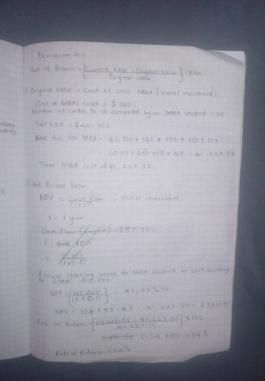 InstructionDISCUSSION ONE: Prior to beginning work on this discussion forum, read Chapter 9, “The Time Value of Money,” in the Foundations of Financial Management In this discussion forum, you will determine the rate of return of your MBA degree. The first step is to calculate the cost of your MBA. If your employer sponsors the cost of your education, you can either use what you would have paid or use opportunity costs as a basis. *EMPLOYEE SPONSORED* After you determine your initial investment, determine the net present value (NPV) of that investment. As an example, let us say “Joe” will be changing jobs when he achieves his MBA and will make 10% more annually as a result. Joe plans to work for 20 more years. His MBA cost was $50,000. Do you forecast that pursuing an MBA is worth the financial investment? Be sure to show all your calculations. Your initial response should be a minimum of 200 words. Support your response with at least ONE scholarly and/or credible resource in addition to the text. DISCUSSION TWO: Prior to beginning work on this discussion forum, read Chapter 11, “Cost of Capital,” in the Foundations of Financial Management textbook and watch the Week 3 Discussion video above with Dr. Kevin Kuznia, Academic Department Chair. Review the WACC and Cost of Capital Allocation https://iad.scorm.canvaslms.com/RusticiEngine/defaultui/player/modern.html?configuration=sconeID&preventRightClick=false&cc=en_US&ieCompatibilityMode=none&cache=20.1.9.169&playerConfUrl=https%3A%2F%2Fiad.scorm.canvaslms.com%2FRusticiEngine%2FPlayerConfiguration.jsp&package=ApiCourseId%7Cscone_prod.sha256_57a0c212a9cd7abf734a798f94d70b4f5554adf4aba6ed2dbef15e4d4ab3e8a7%21VersionId%7C0®istration=ApiRegistrationId%7Cscone_prod.assignment.27859412%21InstanceId%7C0&tracking=true&forceReview=false&RedirectOnExitUrl=https%3A%2F%2Fscone-prod.us-east-1.insops.net%2Fpackages%2F227453%2Flaunch_complete%3Flocale%3Den interactive. For this discussion forum, you will provide a real-world example of how capital allocation was successfully (or unsuccessfully) applied. First, use theUniversity Library to research an article on capital allocation; many articles are available. Select and review the article. For your initial post summarize the article and provide a connection between the article’s concepts and readings for the week. Do any of the concepts in your article agree or disagree with the text? Additionally, based on the findings in your article, explain how the Weighted Average of Cost Capital (WACC) influences investment decisions. Your initial response should be a minimum of 200 words. Graduate school students learn to assess the perspectives of several scholars. Support your response with at least ONE scholarly and/or credible resource in addition to the text. COST OF MBA: A master's degree puts you at another level in a competitive and constantly evolving job market. Tuition and fees for master's students represent the Campus commitment to an online learning experience that is gratifying and accessible. Tuition (per credit) Master of Arts in Curriculum and Instruction $665.00/credit Master of Arts in Early Childhood Education Leadership $665.00/credit Master of Arts in Education $665.00/credit Master of Arts in Human Services $665.00/credit Master of Arts in Leadership $665.00/credit Master of Arts in Psychology $665.00/credit Master of Arts in Public Sociology $665.00/credit Master of Arts in Special Education $665.00/credit Master of Arts in Teaching and Learning with Technology $665.00/credit Master of Public Health $665.00/credit Master of Science in Instructional Design and Technology $665.00/credit Master of Accountancy $740.00/credit Master of Arts in Health Care Administration $740.00/credit Master of Arts in Organizational Management $740.00/credit Master of Business Administration $740.00/credit Master of Human Resource Management $740.00/credit Master of Information Systems Management $740.00/credit Master of Public Administration $740.00/credit Master of Science in Criminal Justice $740.00/credit Master of Science in Finance $740.00/credit Master of Science in Health Informatics and Analytics $740.00/credit Master of Science in Technology Management $740.00/credit Fees: Technology Fee (per course)* $145.00 Books and Materials (average per course) $155.00 Graduation fee $150.00 Official Academic Transcript $10.00 Education Records (per page)^ $0.50 Insufficient funds fee $10.00 Replacement / Duplicate Diploma fee $45.00
