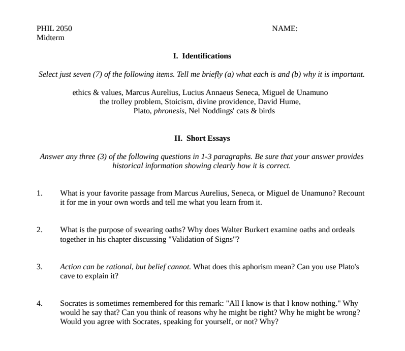 Must know Unamuno, Seneca, and Marcus Aurelius. Answer philosophy worksheet. Short essays required