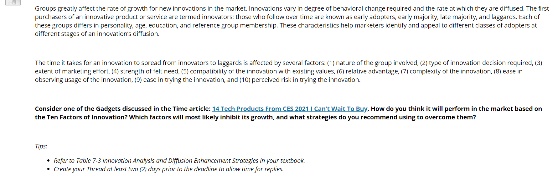 InstructionThe time it takes for an innovation to spread from innovators to laggards is affected by several factors: (1) nature of the group involved, (2) type of innovation decision required, (3) extent of marketing effort, (4) strength of felt need, (5) compatibility of the innovation with existing values, (6) relative advantage, (7) complexity of the innovation, (8) ease in observing usage of the innovation, (9) ease in trying the innovation, and (10) perceived risk in trying the innovation. Consider one of the Gadgets discussed in the Time article: 14 Tech Products From CES 2021 I Can’t Wait To Buy. How do you think it will perform in the market based on the Ten Factors of Innovation? Which factors will most likely inhibit its growth, and what strategies do you recommend using to overcome them? Tips: Refer to Table 7-3 Innovation Analysis and Diffusion Enhancement Strategies in your textbook.