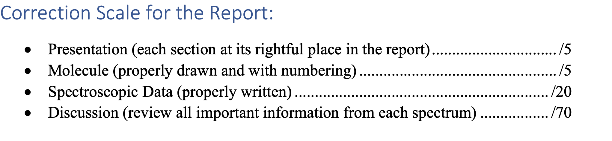 • Its should first not be written like a rough draft of a homework! It should have a goal: A section for the spectra, the molecule and a discussion on how you obtained that result! It counts for 40% of my final grade! This would be a guaranteed Zero!