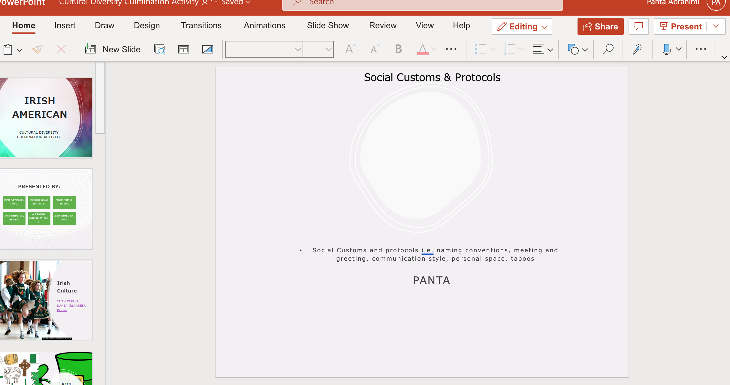 5 slides power point presentation with 2 references (this is my part on a group assignment) for:Culture diversity class topic : Social Customs and Protocols of Irish American ie: naming conventions, meeting and greeting, Communication style , personal space , taboos . things not to say to Irish.