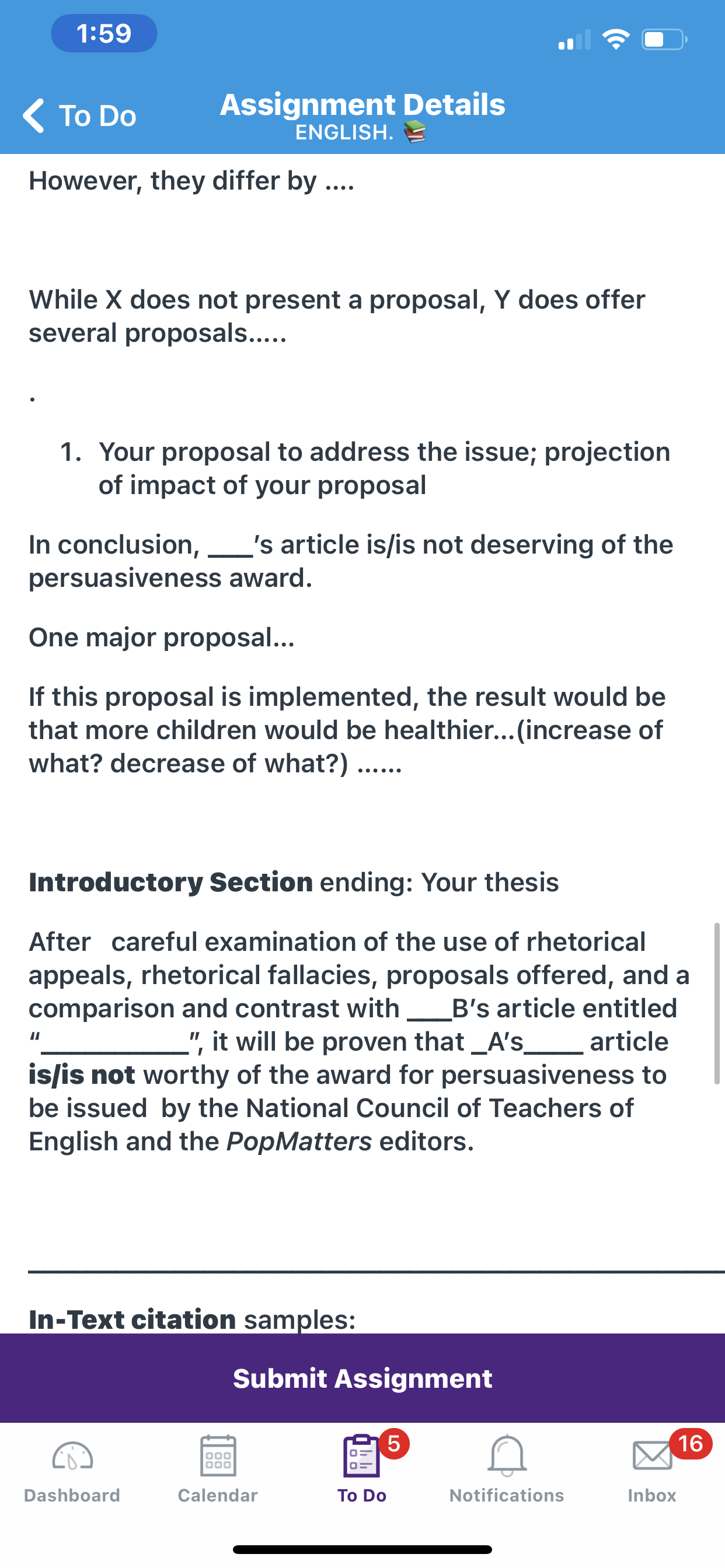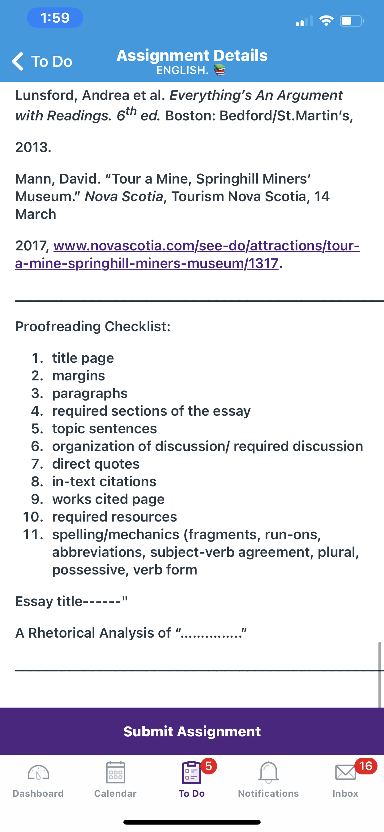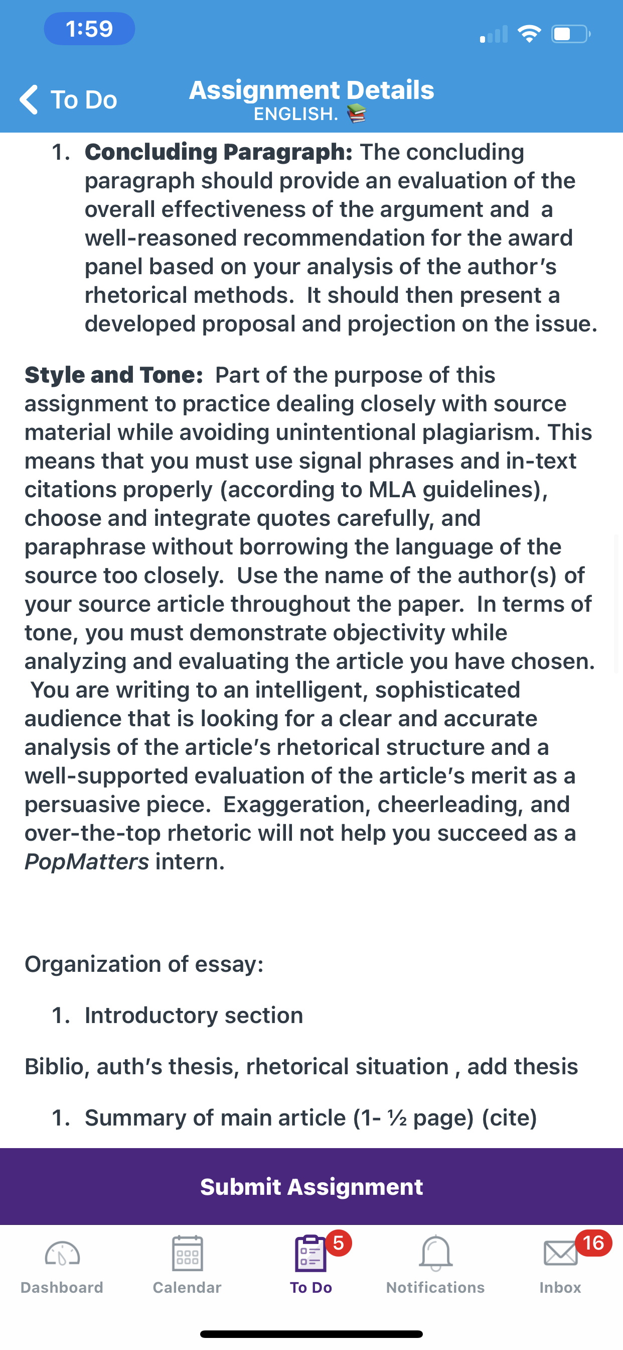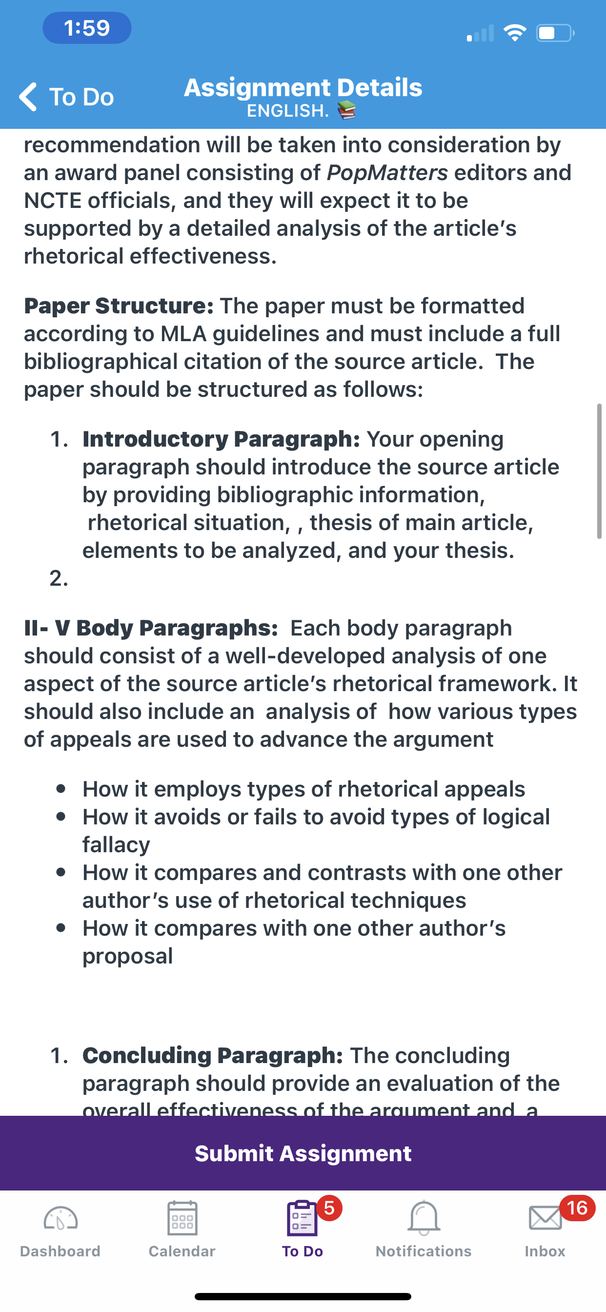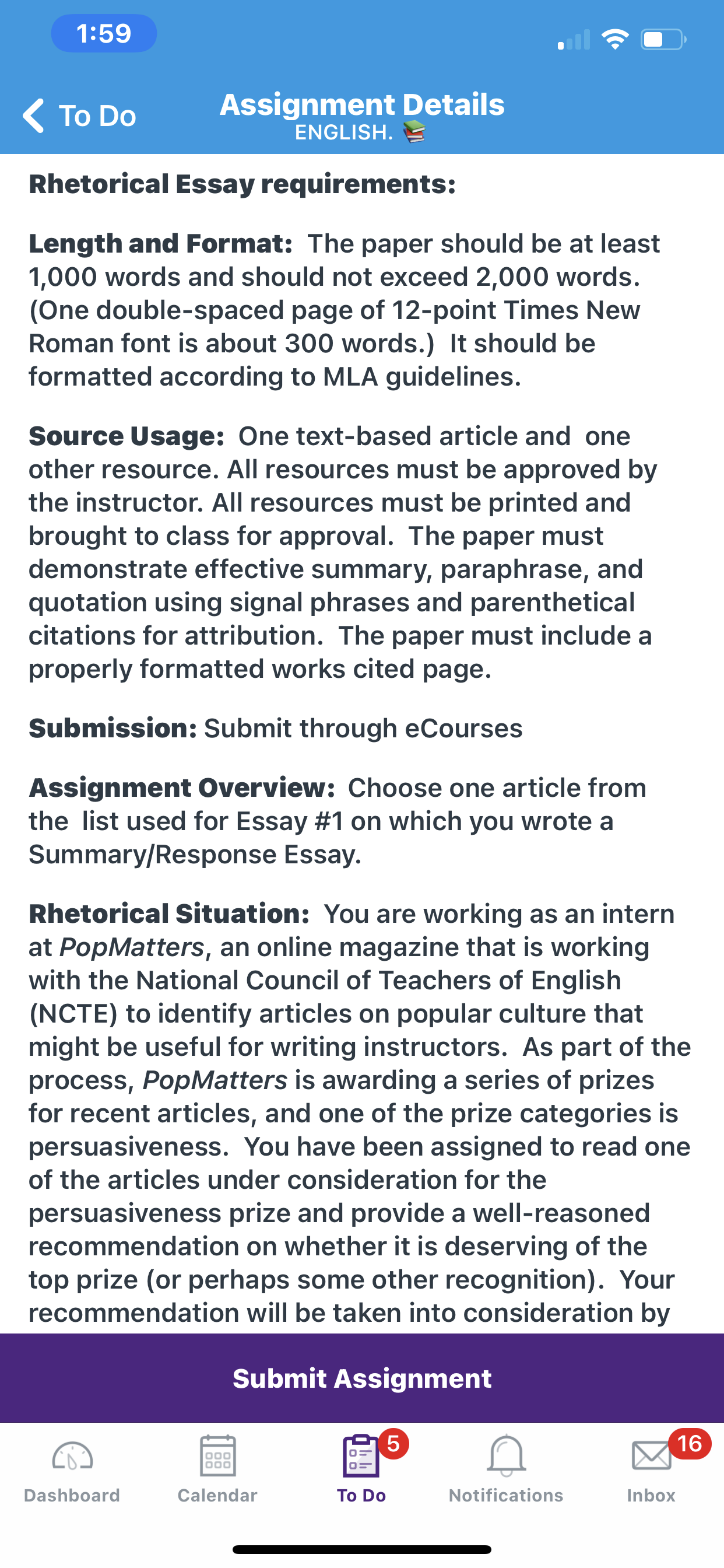 The paper should be at least 1,000 words and should not exceed 2,000 words. (One double-spaced page of 12-point Times New Roman font is about 300 words.) It should be formatted according to MLA guidelines. One text-based article and one other resource. All resources must be approved by the instructor. All resources must be printed and brought to class for approval. The paper must demonstrate effective summary, paraphrase, and quotation using signal phrases and parenthetical citations for attribution. The paper must include a properly formatted works cited page.