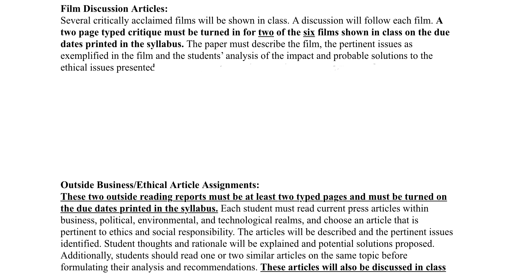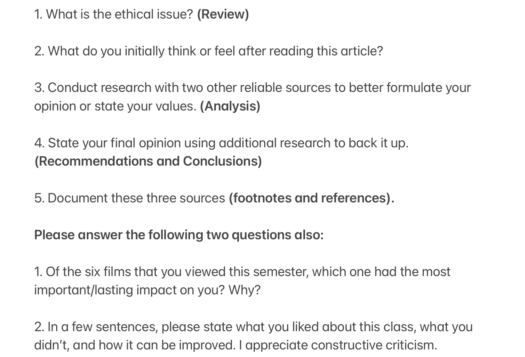 • I need clarification. I am supposed to select two articles and write 3- 4 pages about each article answering the first set of questions, that is questions 1 to 5. That is a total of 6 to 7 pages. And then on top of that, I have to answer the other 2 questions 1 and 2 about the films and what I liked about the class. Is that right? That means more than 6 to 8 pages. Is that right? Please clarify. And How do I know what you studied in class? Or will you do the other two questions about films and what you liked and disliked about the class by yourself?